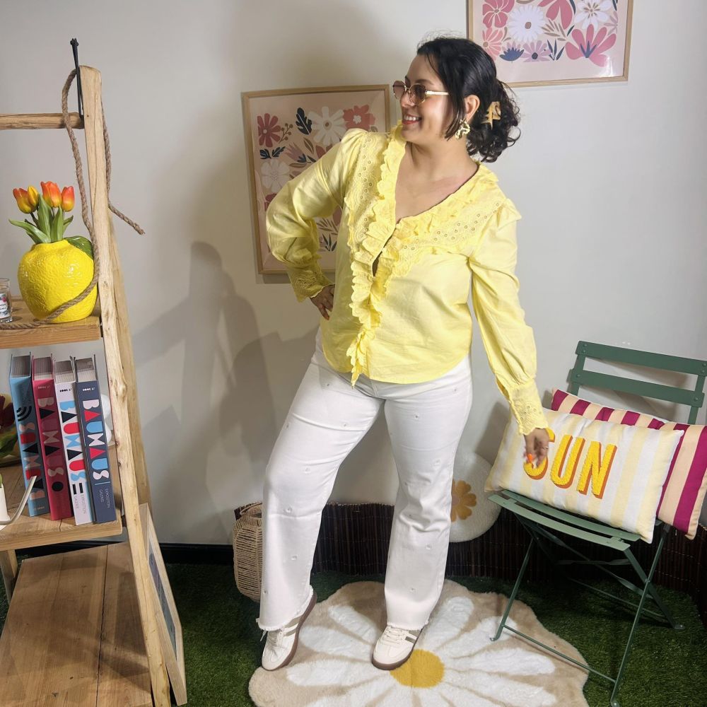 Sa teinte jaune douce apporte de la fraîcheur, tandis que ses volants délicats et ses broderies raffinées sur le devant et aux manches lui donnent un charme bohème irrésistible.