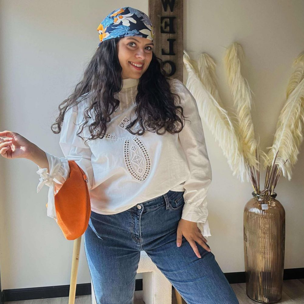 La blouse Iseandre charme par ses broderies ajourées et son col montant plissé, véritables clins d’œil aux inspirations vintage. Son tissu en coton doux, léger et respirant, accompagne vos mouvements avec fluidité et élégance.
