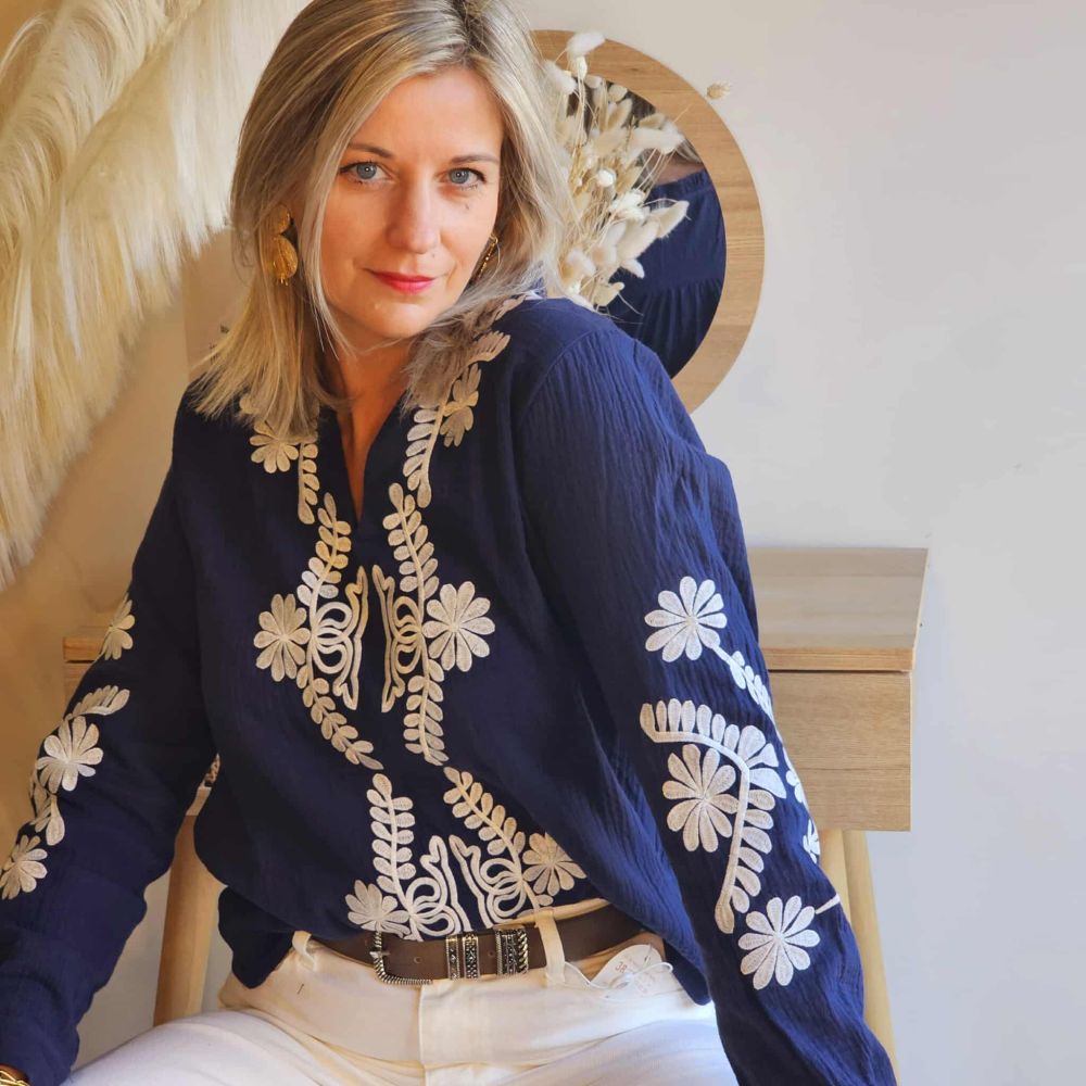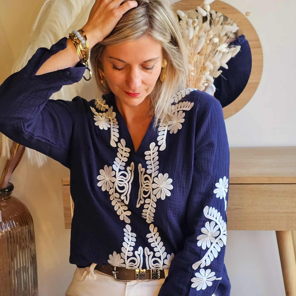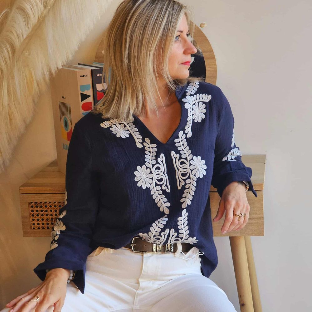 Blouse Roxy – Bleu Marine Brodée Blanche