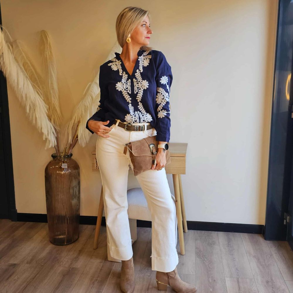 La blouse Roxy est une pièce bohème et élégante qui apporte du caractère à une tenue simple. Son tissu bleu marine fluide est rehaussé de magnifiques broderies blanches en forme de fleurs et arabesques, pour un contraste raffiné et lumineux. Avec sa coupe droite et son col en V, elle allie confort et féminité.