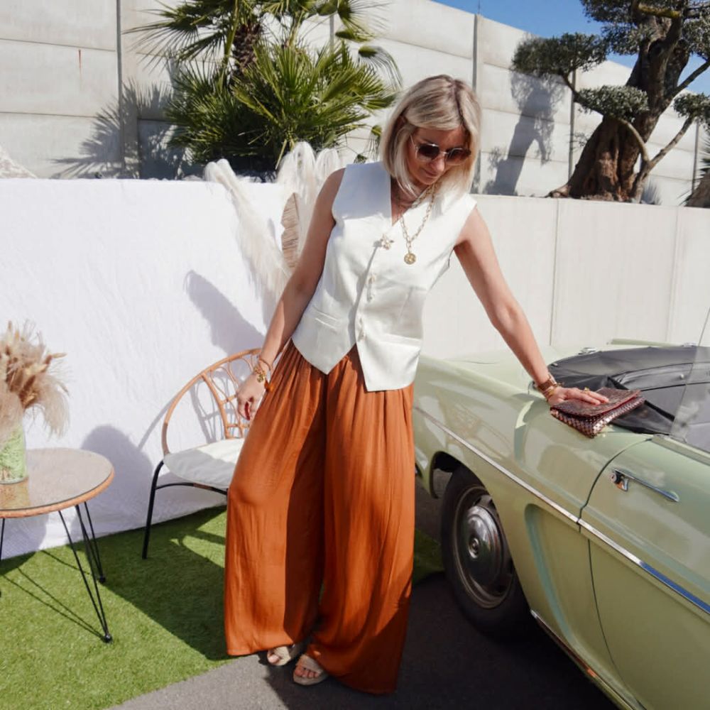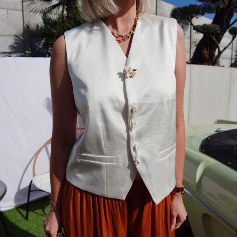 Son aspect légèrement satiné illumine la silhouette, tandis que sa coupe structurée sans manches lui donne une allure moderne et sophistiquée. Sur le devant, on retrouve une fermeture subtile ornée de détails coquillage, apportant une touche originale et précieuse.