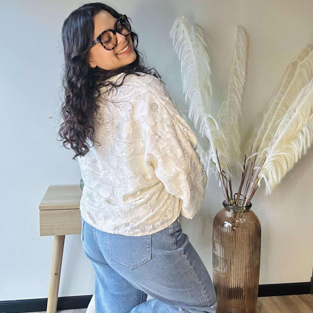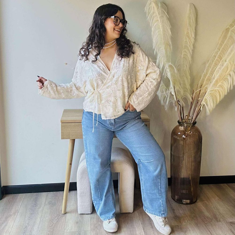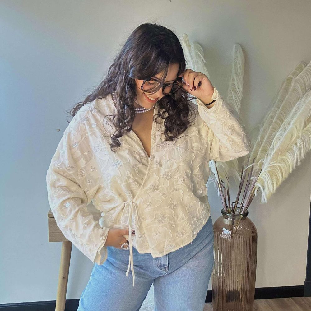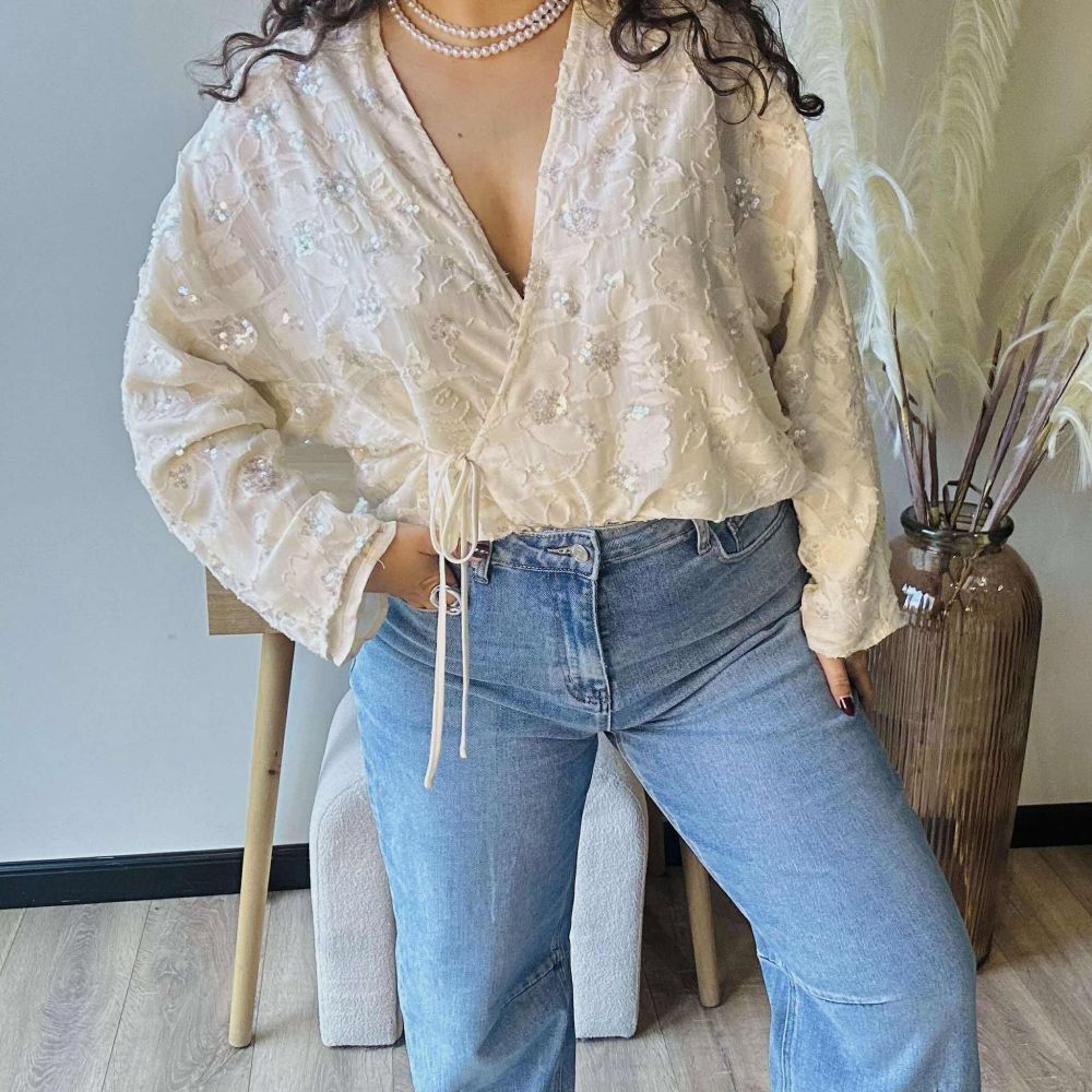 Sa teinte écru lumineuse est sublimée par des broderies florales rehaussées de sequins discrets, qui captent subtilement la lumière pour un effet raffiné. Facile à nouer grâce à son lien sur le côté, le Cache-Cœur Charlie s’adapte à toutes les morphologies et se porte aussi bien avec un jean qu’une jupe pour un look chic et romantique.
