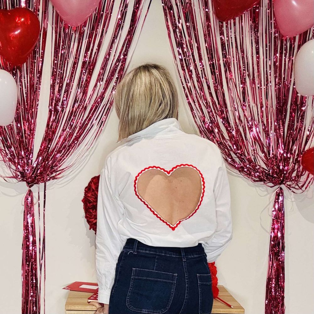 Son détail signature se dévoile dans le dos : un grand cœur brodé rouge, délicatement ouvert, qui laisse subtilement apparaître la peau. Ce jeu de transparence apporte une touche sensuelle et romantique, tout en restant chic et raffiné. Un détail fort qui transforme une chemise classique en pièce unique.