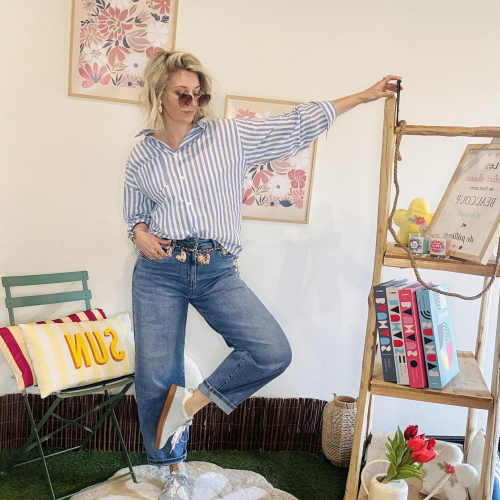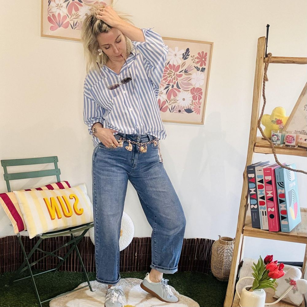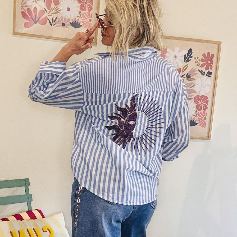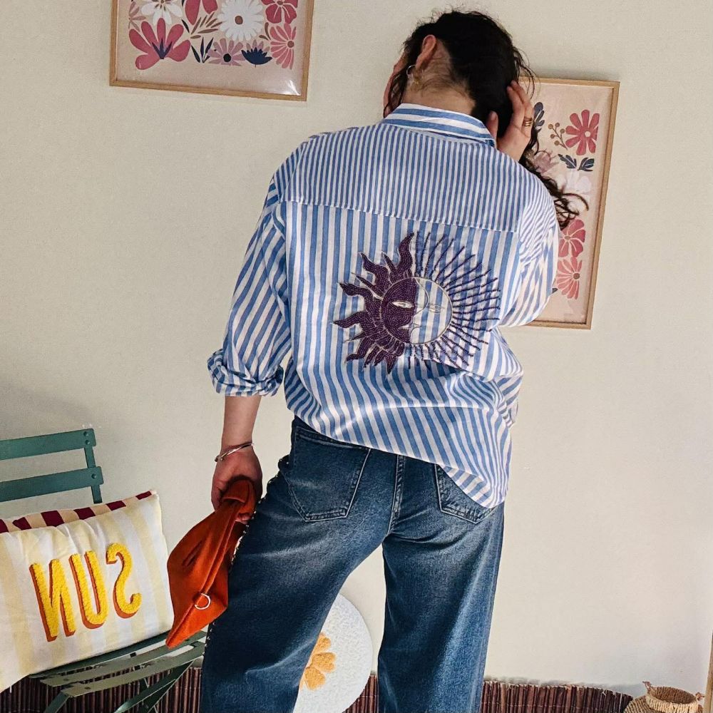 Son motif à rayures bleu et blanc apporte une allure intemporelle, tandis que le détail signature dans le dos – un sublime soleil brodé en coloris aubergine orné de perles – apporte une touche bohème chic et lumineuse.