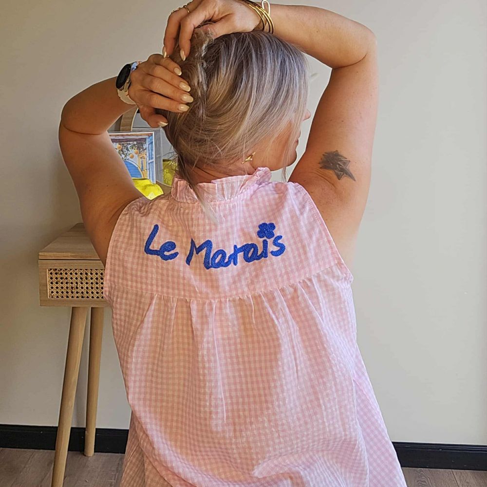 Empiècement brodé au dos avec l’inscription “Le Marais” en bleu intense, une signature poétique qui rappelle l’esprit parisien libre et raffiné