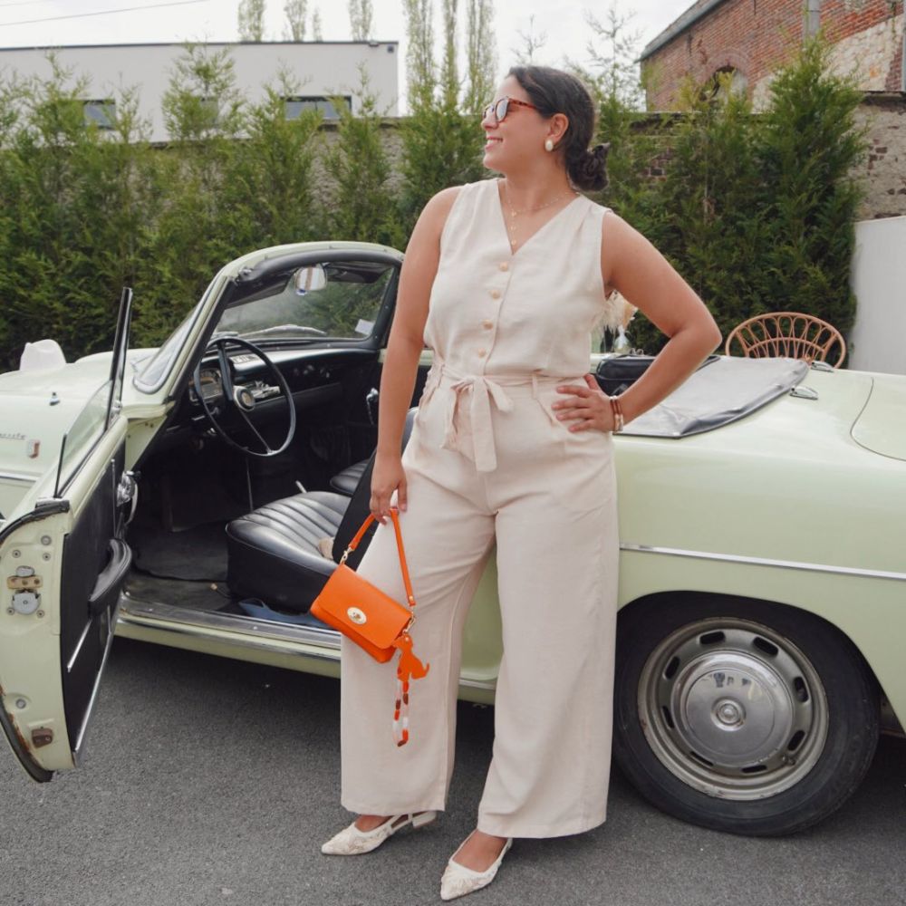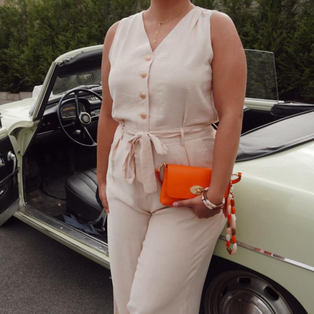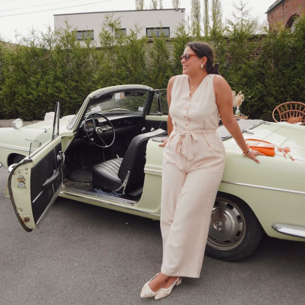 Son haut sans manches avec décolleté en V et boutons dorés apporte une touche raffinée et lumineuse. La taille est sublimée par un élastique discret et une ceinture assortie, permettant d’ajuster parfaitement la combinaison à votre morphologie.