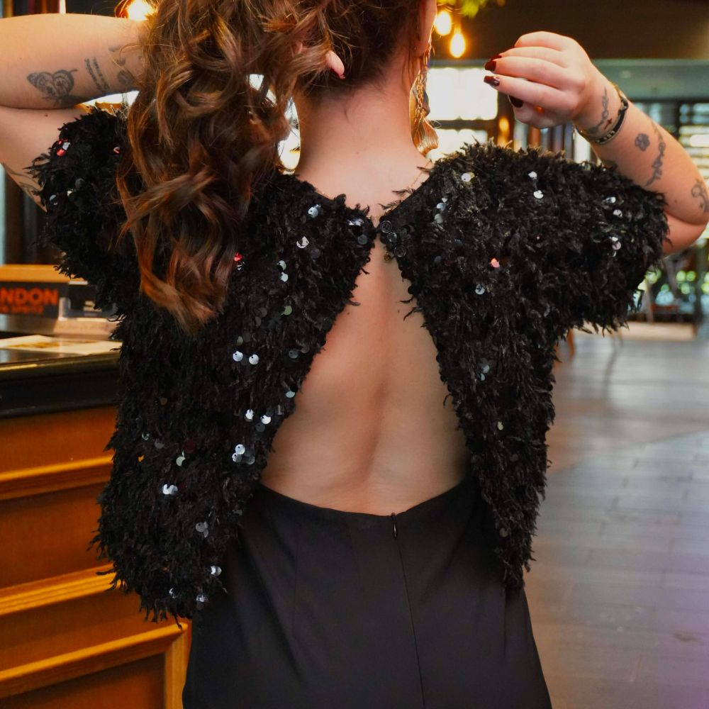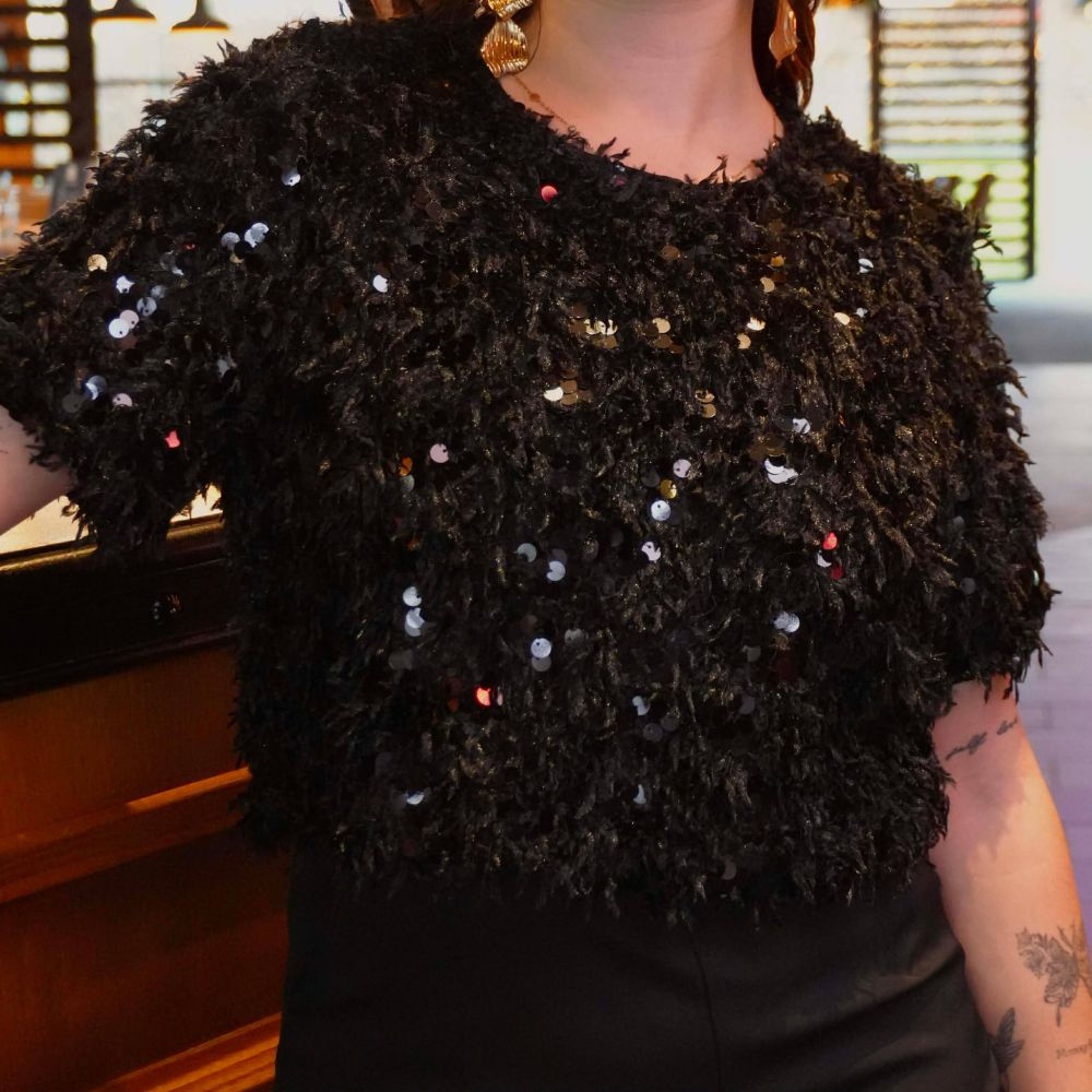 - Haut texturé : poils + sequins