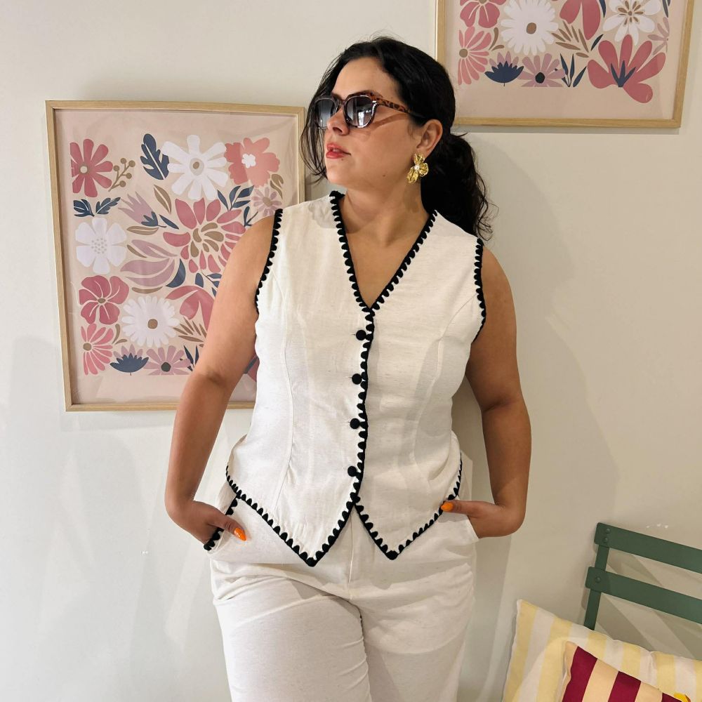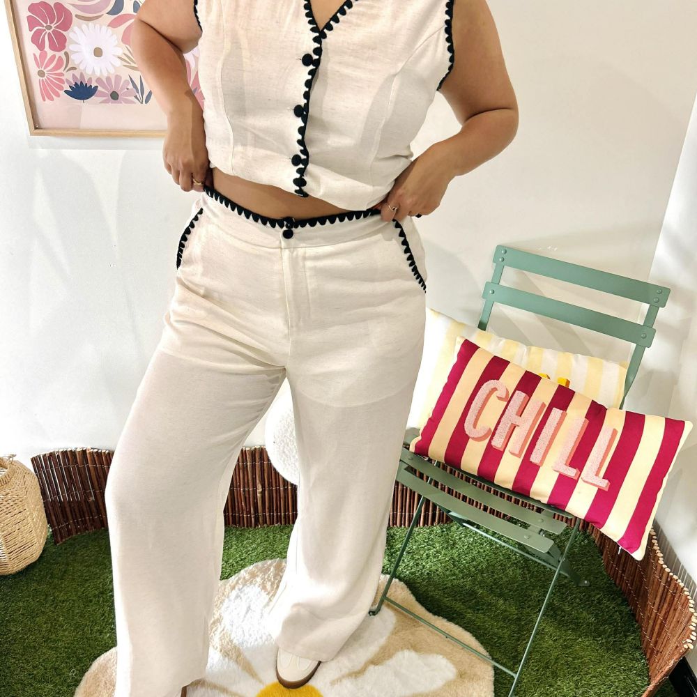 Les détails brodés noirs viennent souligner les lignes du boléro et du pantalon, créant un contraste subtil et raffiné.