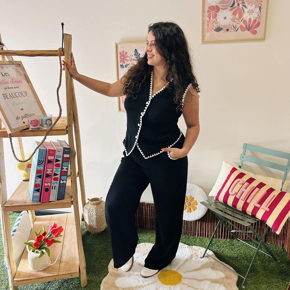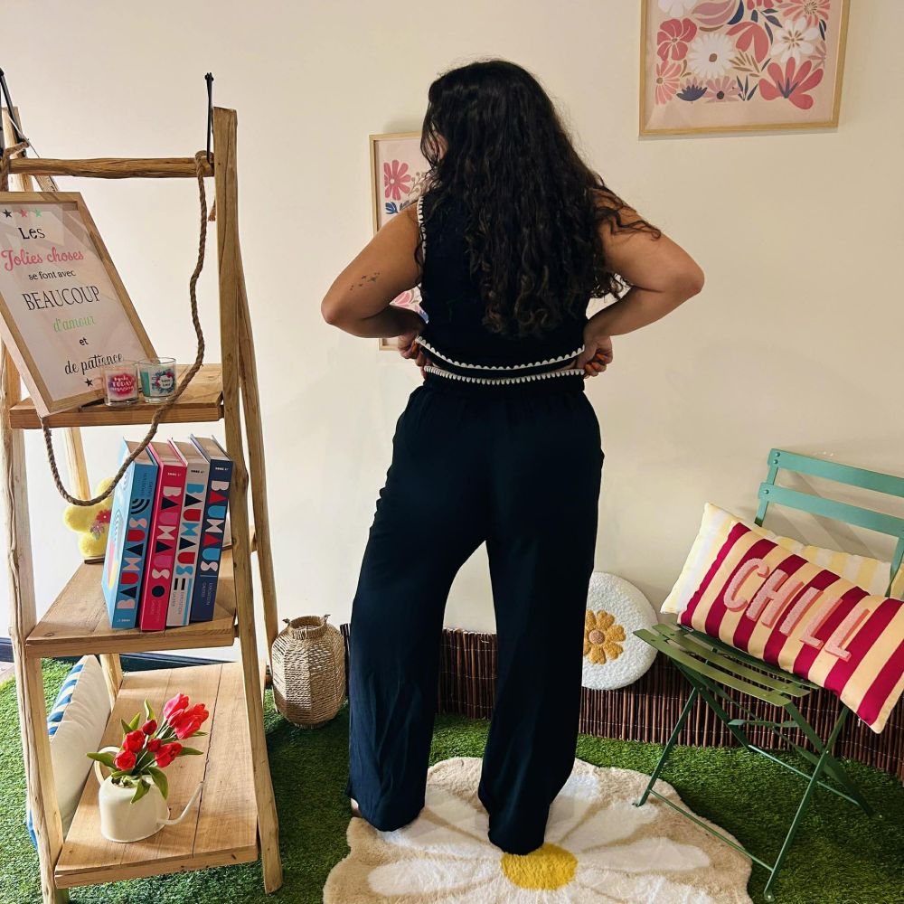 L’ensemble Olympe se compose d’un boléro sans manches structuré et d’un pantalon fluide à taille élastique, offrant une silhouette élégante sans compromis sur le confort.