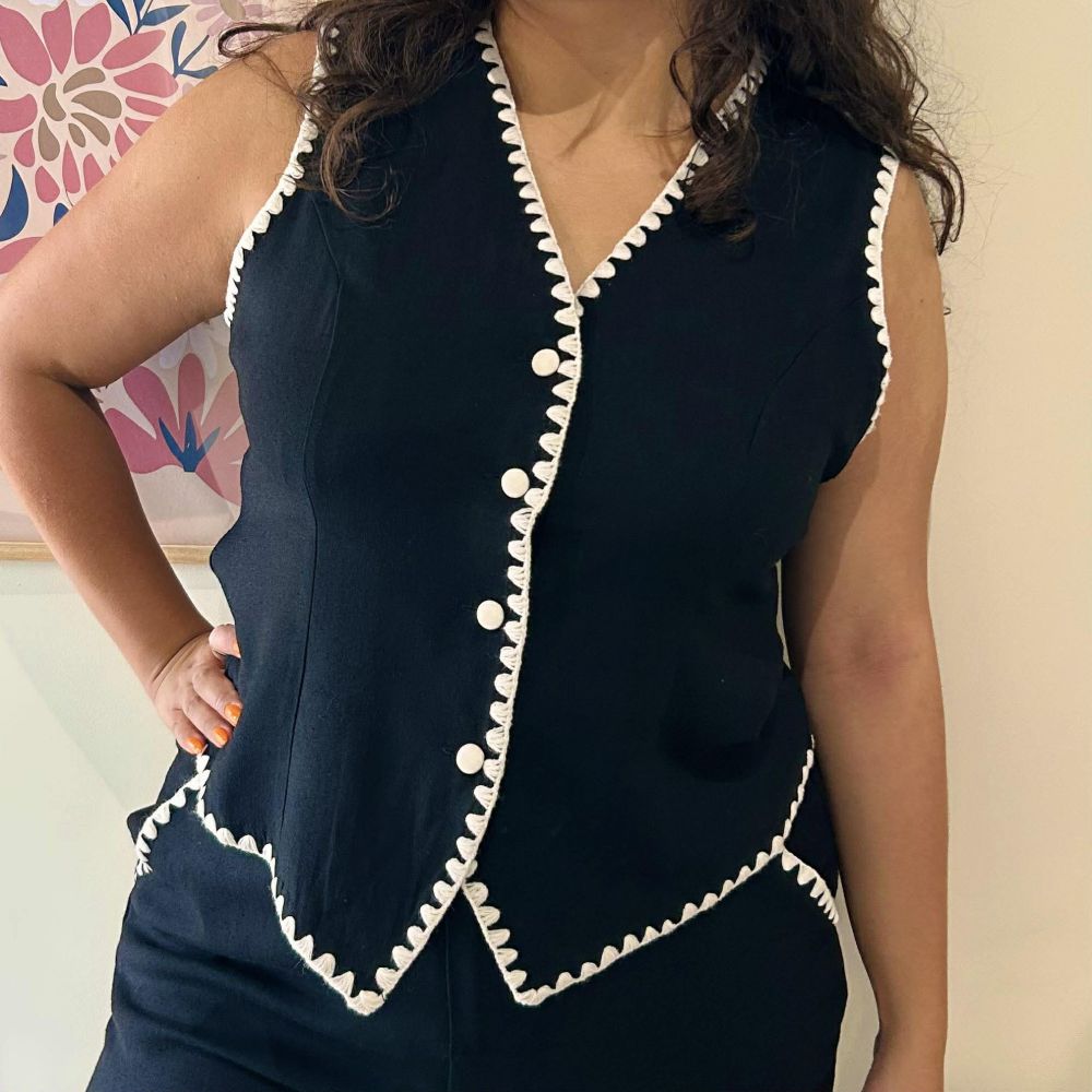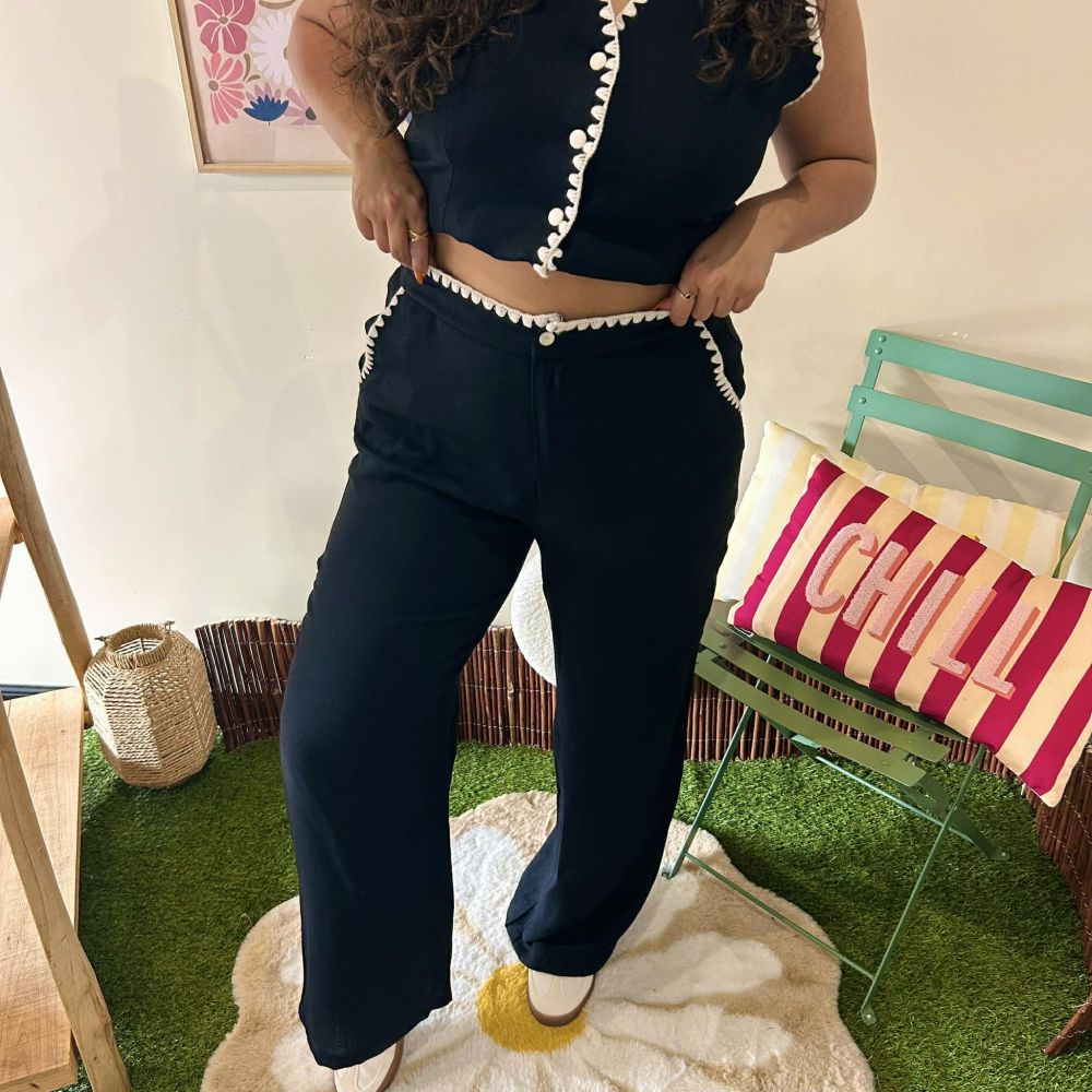 Les détails brodés contrastés viennent souligner les lignes du boléro et du pantalon, créant un contraste subtil et raffiné.
