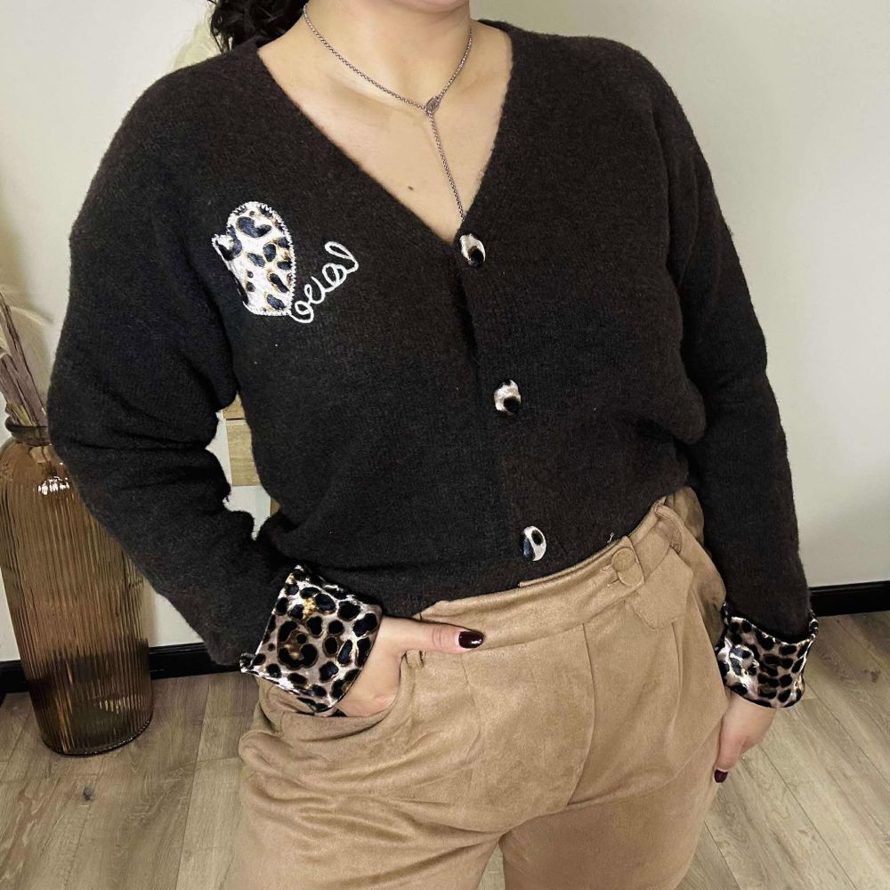 Le gilet Félix mise sur l’élégance du marron chocolat et l’originalité de ses manches en velours léopard. On adore ses boutons effet velours et sa broderie “Love” sur la poitrine, pour une touche chic et tendance.