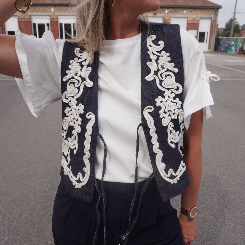 Le boléro Sofia est une pièce forte et originale qui allie esprit bohème et allure contemporaine. Confectionné en denim brut de qualité, il se distingue par ses broderies contrastantes écrues placées avec finesse sur l’avant, apportant une touche d’élégance et d’authenticité. Sa coupe courte et structurée sublime la silhouette et permet de l’associer aussi bien avec un jean, un pantalon taille haute qu’une robe fluide pour un look tendance et affirmé.