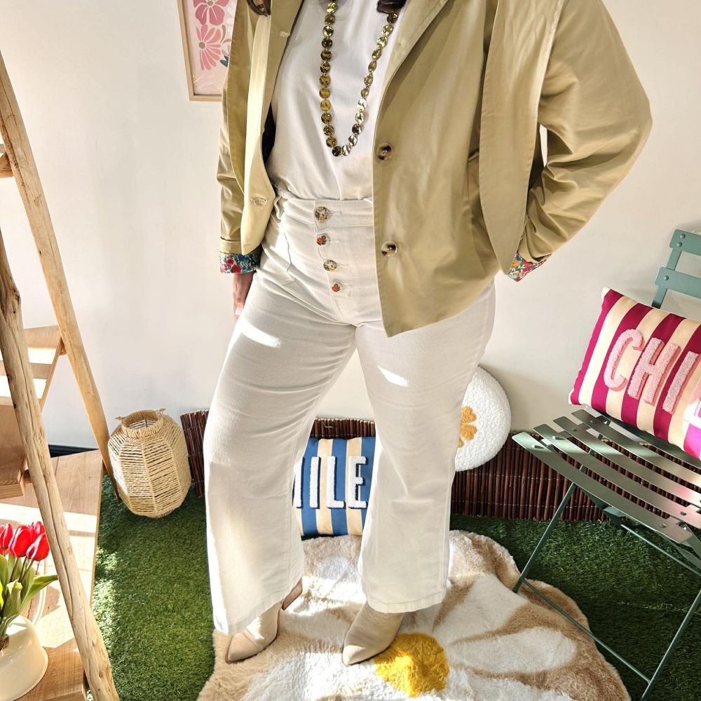 Jean Bianca Blanc – Taille Haute & Boutons Brodés Colorés