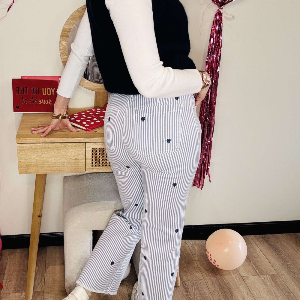 Le jean LOVER revisite le denim avec une coupe wide ultra tendance, un imprimé rayures blanc & bleu hyper frais, et surtout un détail adorable : des petits cœurs brodés bleu marine répartis sur le jean