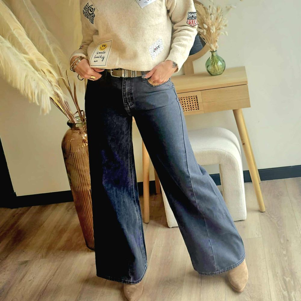 Jean évasé taille haute Sidonie – coupe flare noir gris délavé