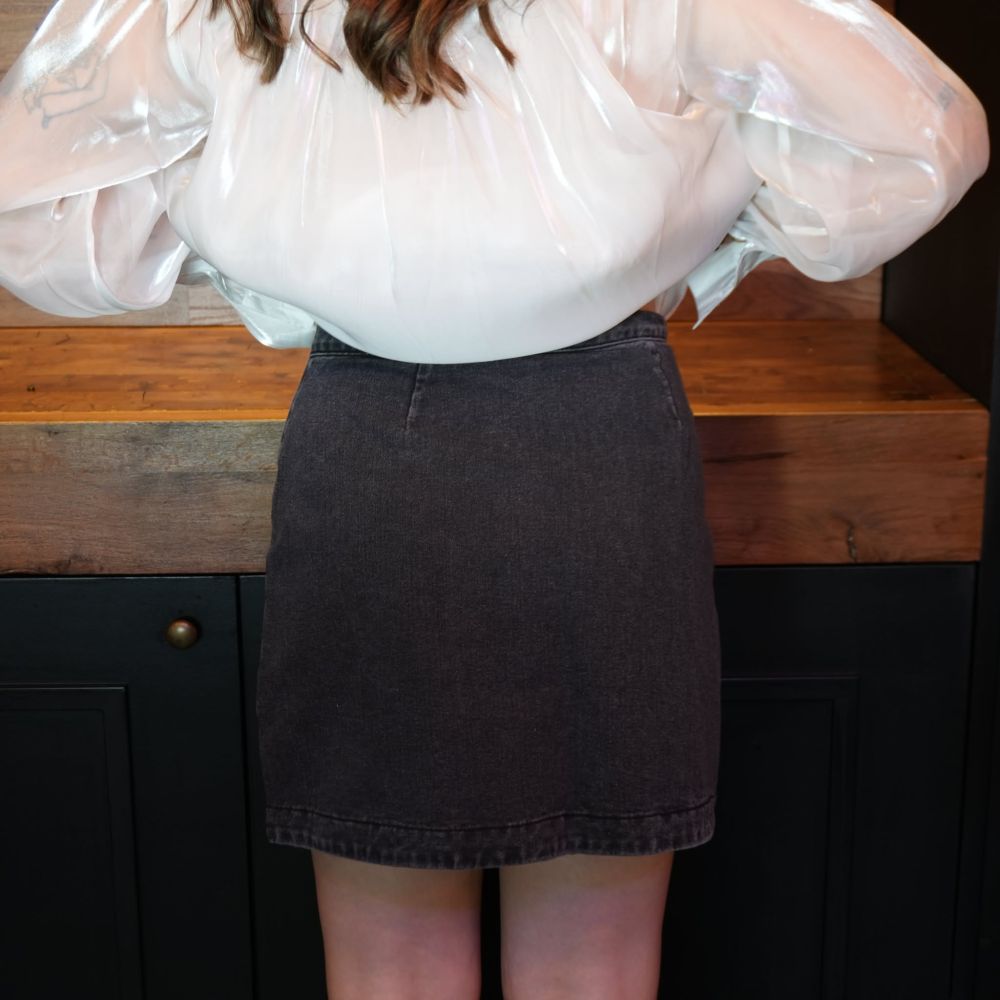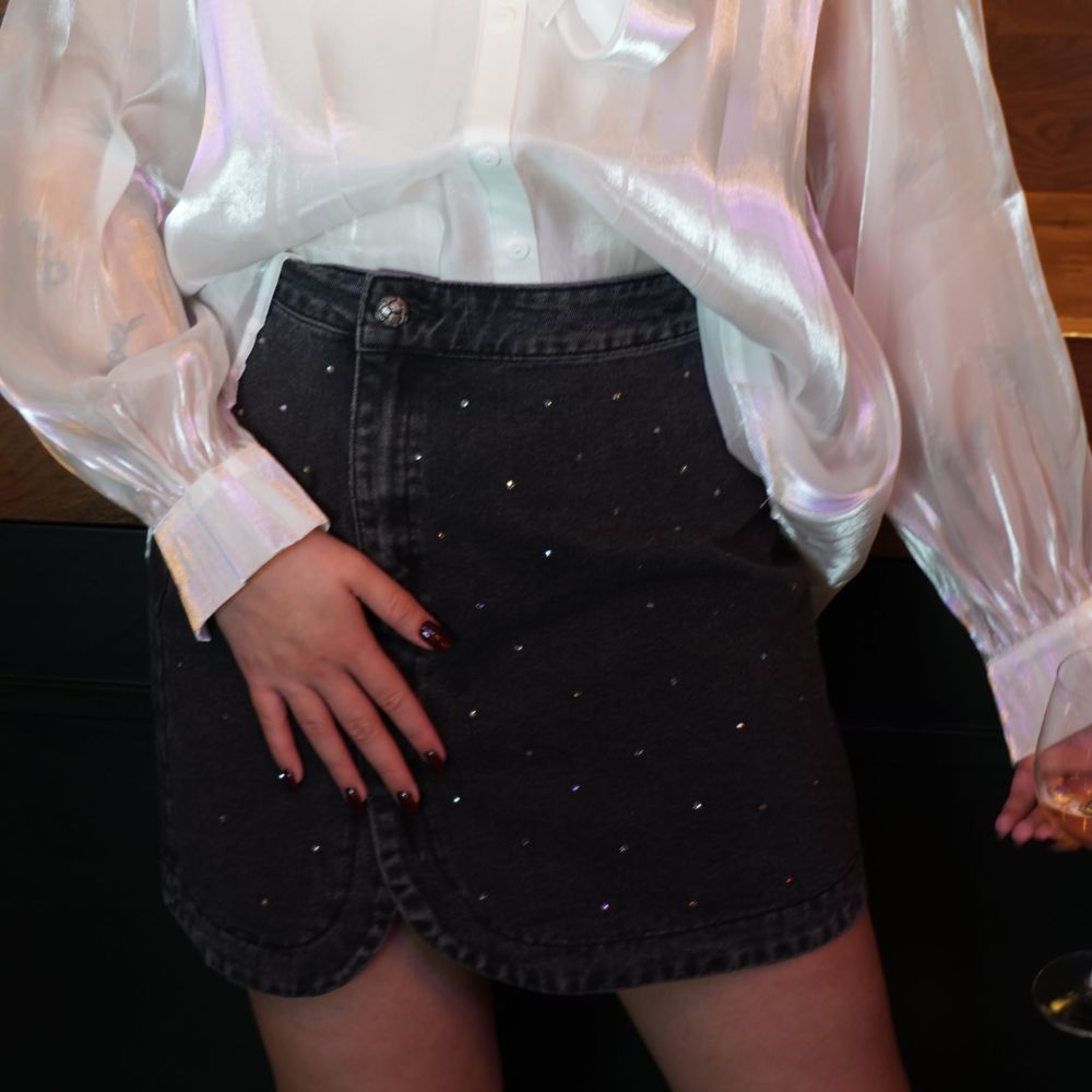La Jupe Adixia est la jupe parfaite pour apporter une touche glam à un look du quotidien. En denim gris, elle est rehaussée de petits strass délicatement répartis sur l’ensemble, pour un rendu subtil mais ultra lumineux dès que la lumière accroche.