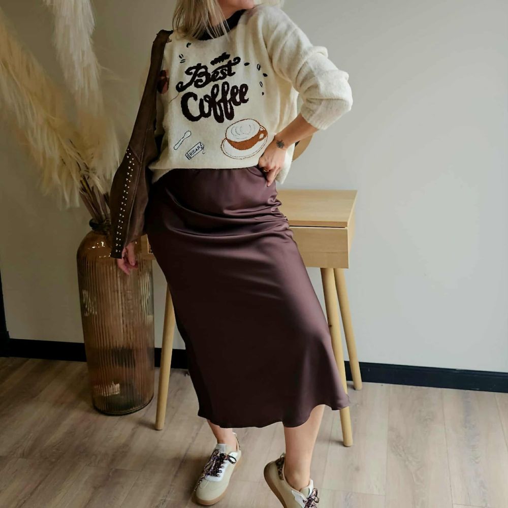 La jupe Beryl allie élégance et confort grâce à sa matière satinée fluide et sa taille élastique ultra pratique. Sa coupe midi met en valeur la silhouette tout en offrant un tombé raffiné et féminin. Parfaite avec un pull oversize ou un top ajusté pour un look chic et moderne.