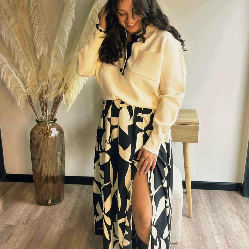 Son imprimé noir et beige graphique attire le regard par son jeu de contrastes moderne et élégant. La fente sur le côté apporte une touche sensuelle et féminine, idéale pour dévoiler subtilement la jambe tout en conservant une allure chic.