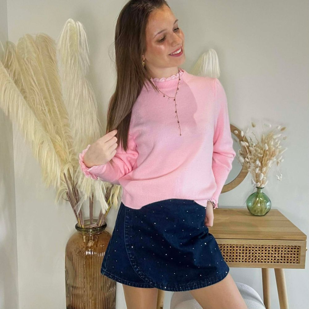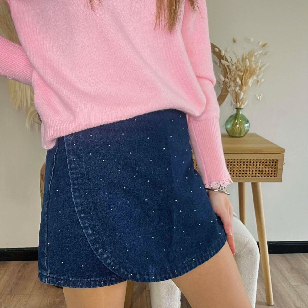 Jupe-short Jenna en jean bleu brut – Détails paillettes sur le devant