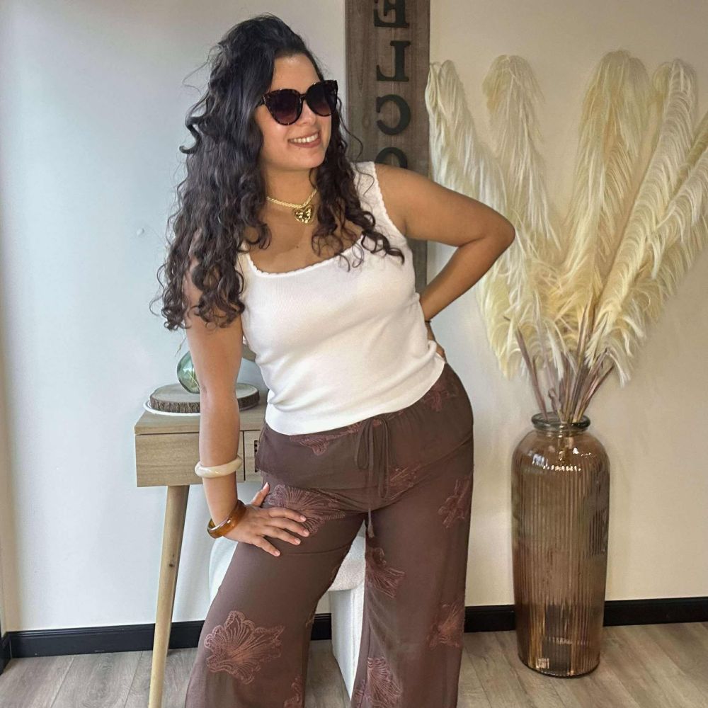 Succombez au charme naturel du pantalon Carmen, une pièce fluide et bohème aux accents chaleureux. Son coloris chocolat profond est sublimé par de délicates broderies florales ton sur ton, apportant texture et raffinement tout en subtilité.