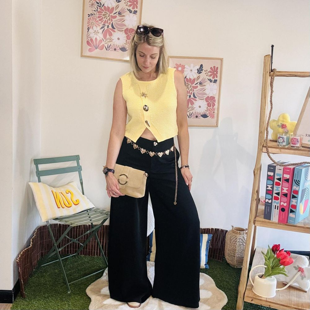 Sa taille haute structurée est sublimée par un joli boutons dorés, qui ajoutent une touche raffinée et féminine au modèle. Le pantalon est doté de poches sur le devant pour plus de praticité et d’une fausse poche cousue à l’arrière pour une finition élégante !