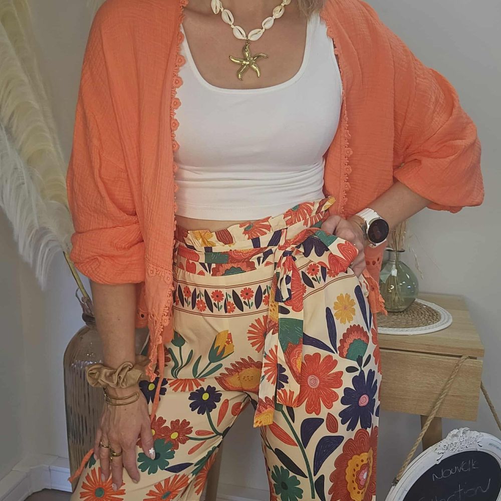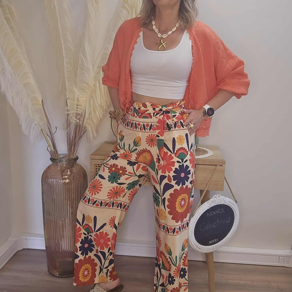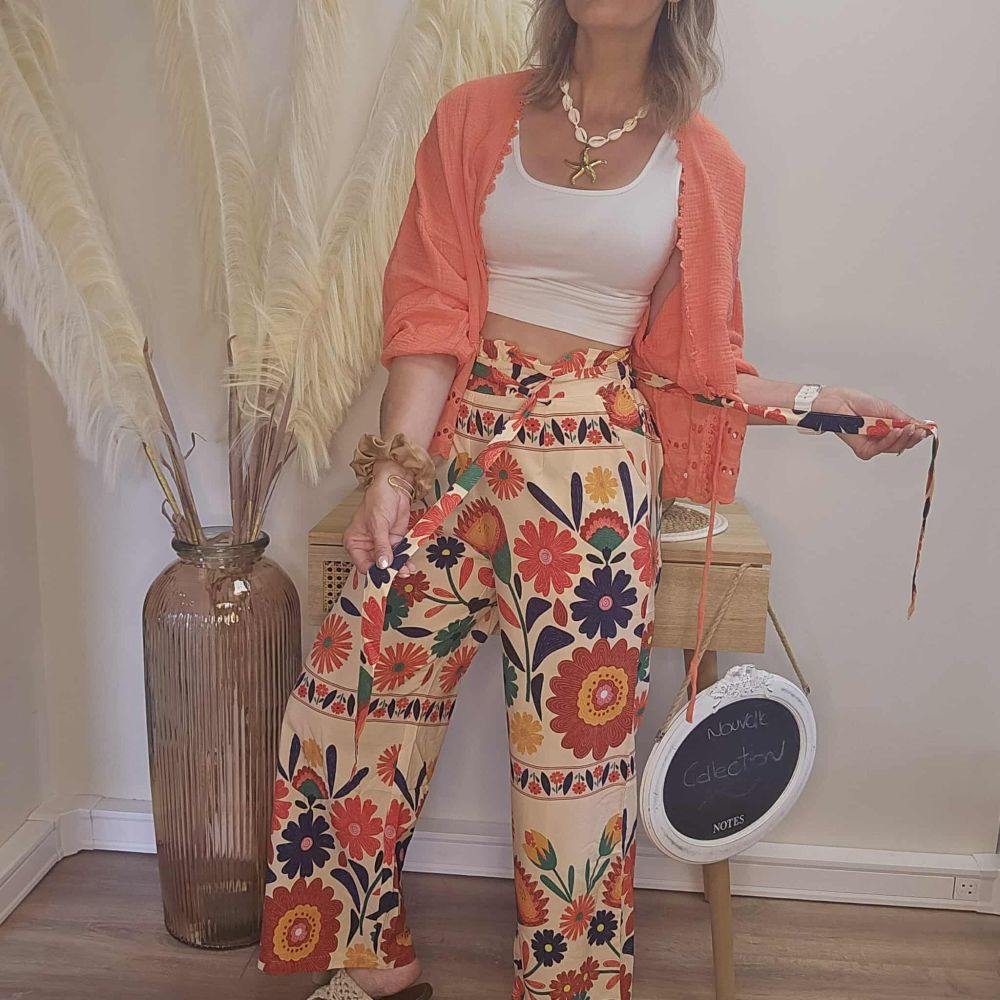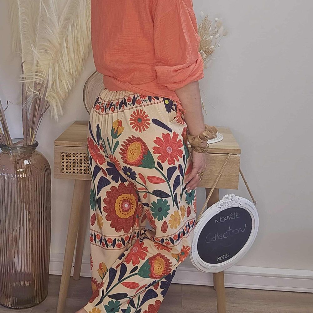 Le pantalon LISON insuffle une dose de bonne humeur à votre dressing grâce à son imprimé floral multicolore sur fond beige lumineux.