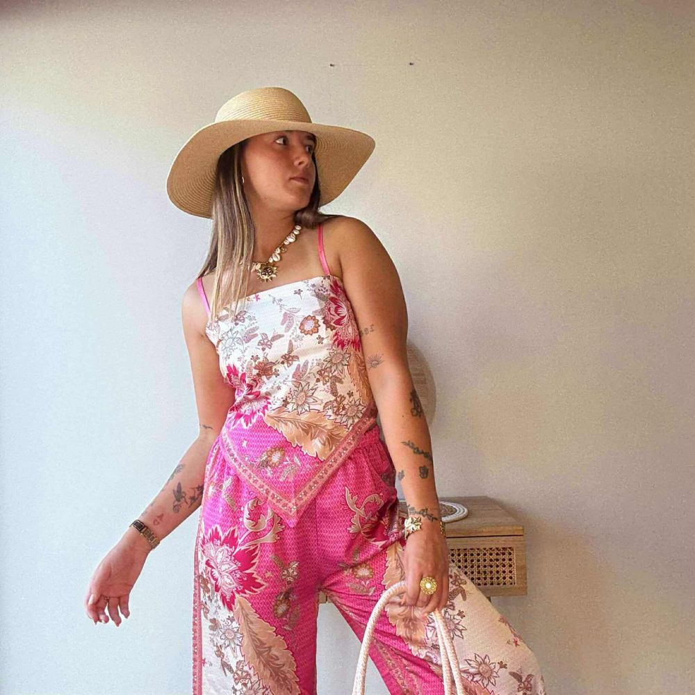 Succombez au charme vibrant du pantalon Oziris, un modèle fluide et léger qui conjugue parfaitement style bohème et confort estival. Son imprimé floral oversize mêle des nuances de rose fuchsia, beige doré et écru dans un motif baroque aux influences orientales, pour une allure audacieuse et féminine.