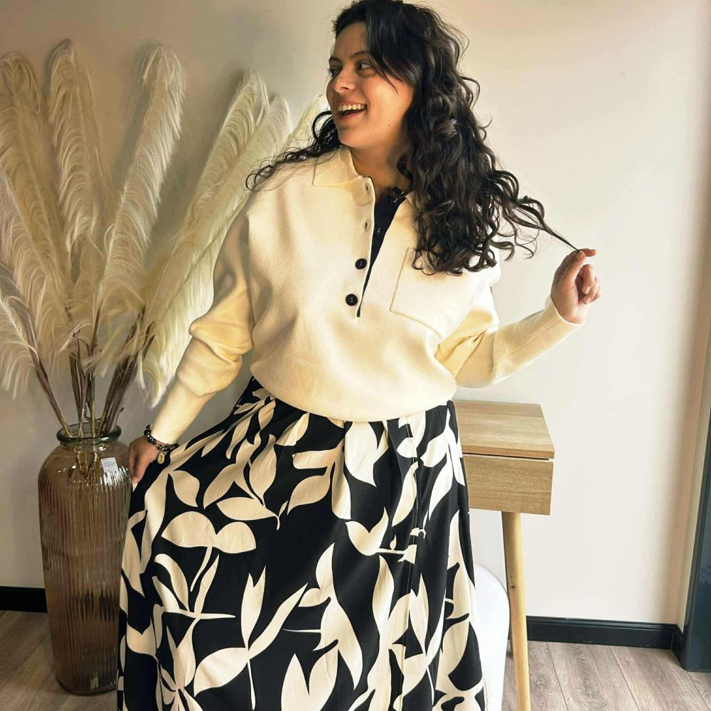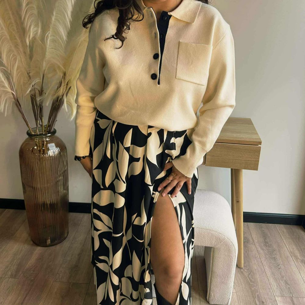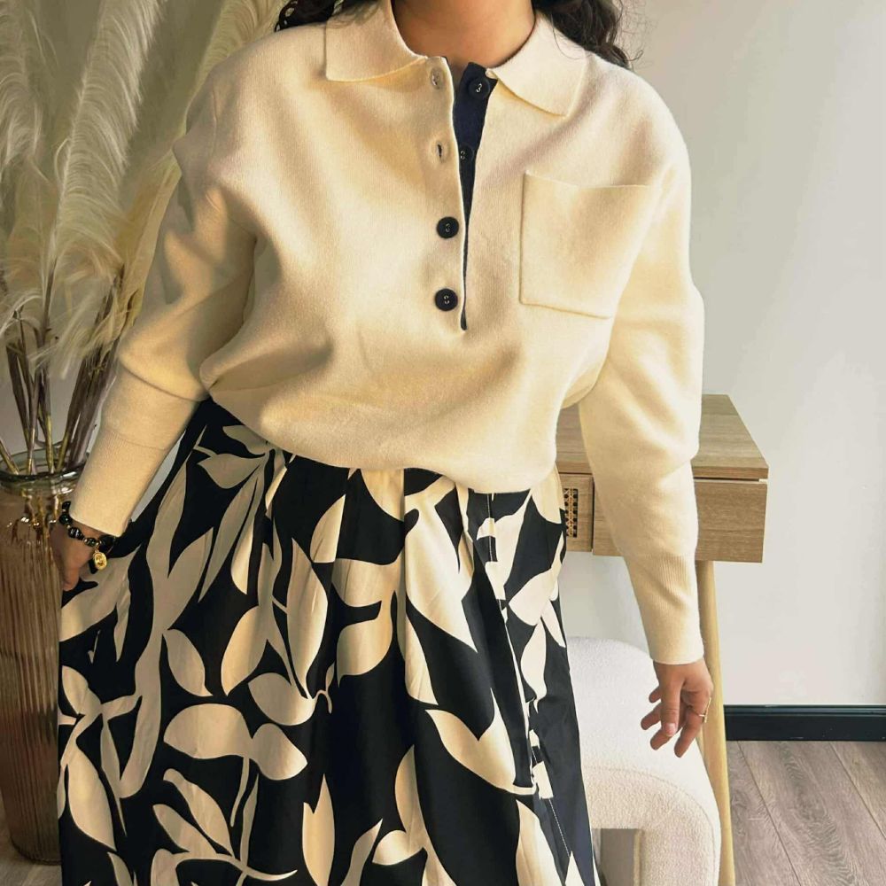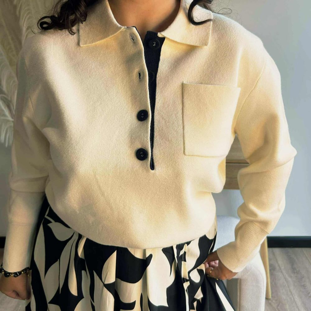 Doté d’un col polo revisité et d’une patte de boutonnage contrastante ornée de quatre boutons noirs, le pull Cléa allie raffinement et modernité. Sa poche plaquée sur la poitrine ajoute une touche d’originalité subtile.