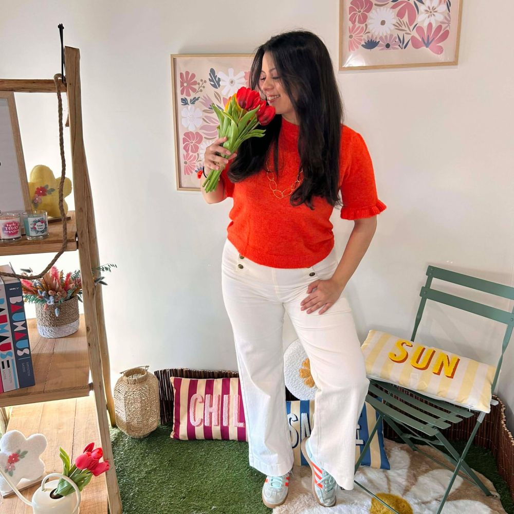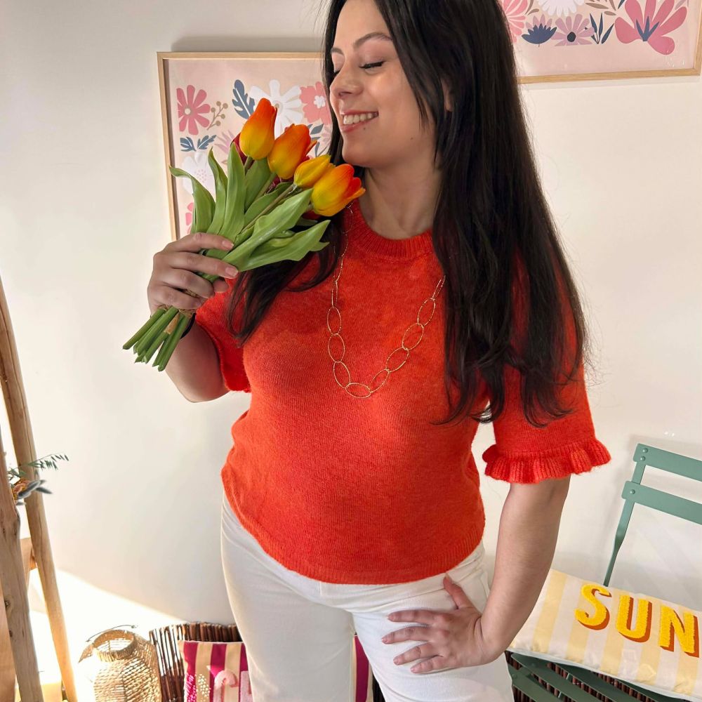 Le pull Clémentine illumine la silhouette avec son orange vibrant ultra lumineux et ses jolis volants aux manches qui ajoutent une touche féminine et chic.