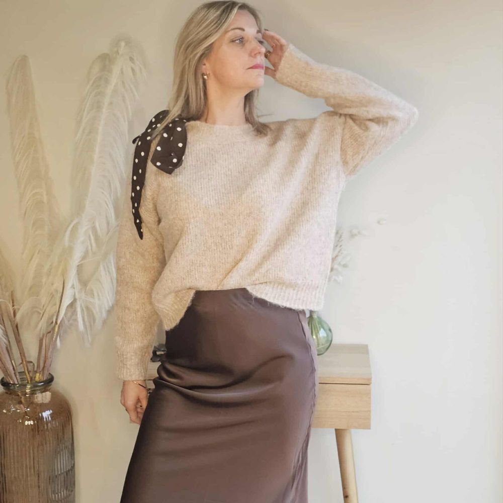 Son détail unique — une ouverture à l’épaule ornée d’un joli nœud chocolat à pois — apporte une note raffinée et subtilement rétro, parfaite pour sublimer une tenue du quotidien.