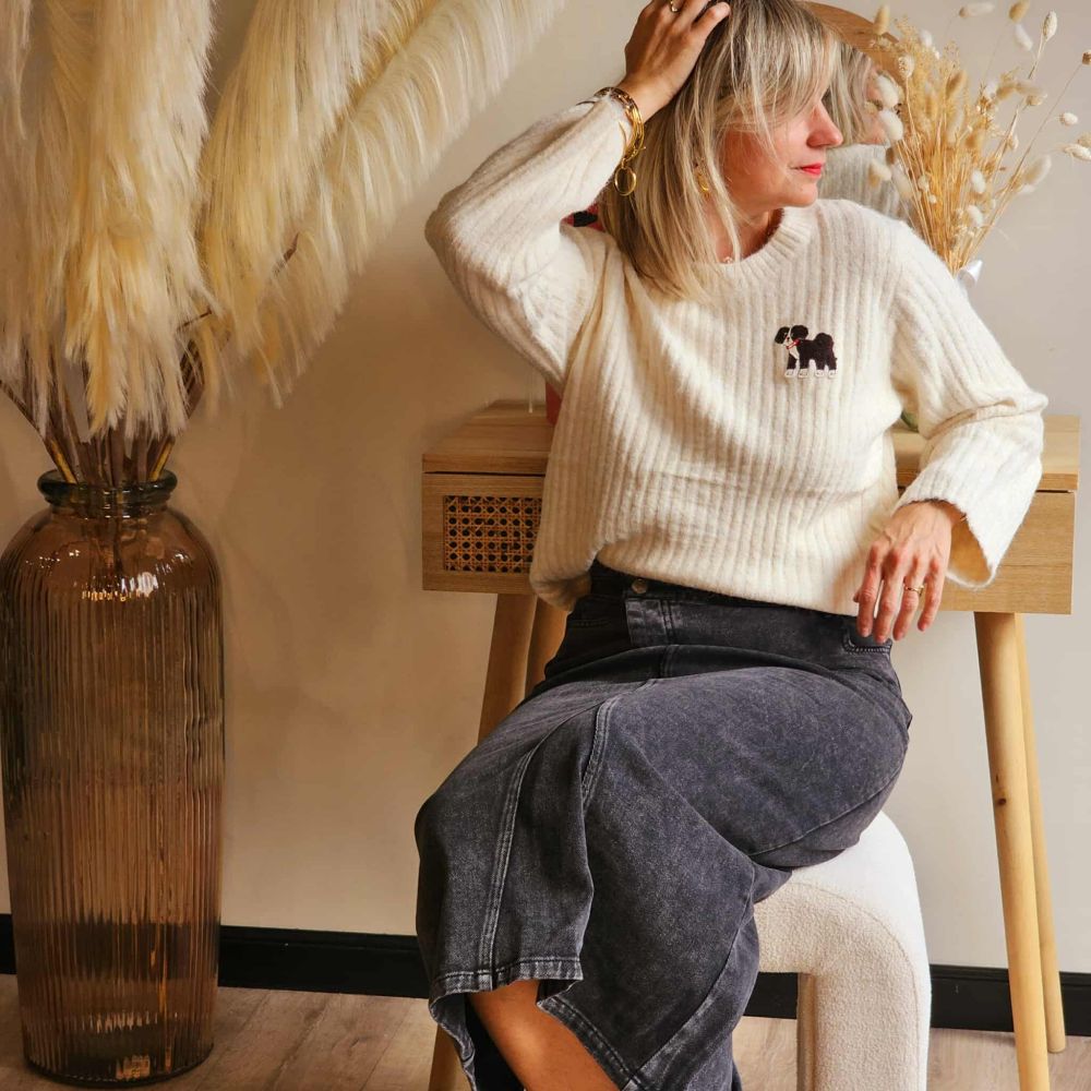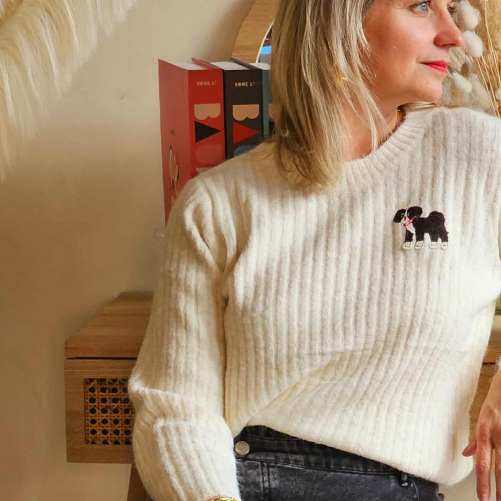 Pull Milo – Pull écru en maille côtelée avec broderie chien