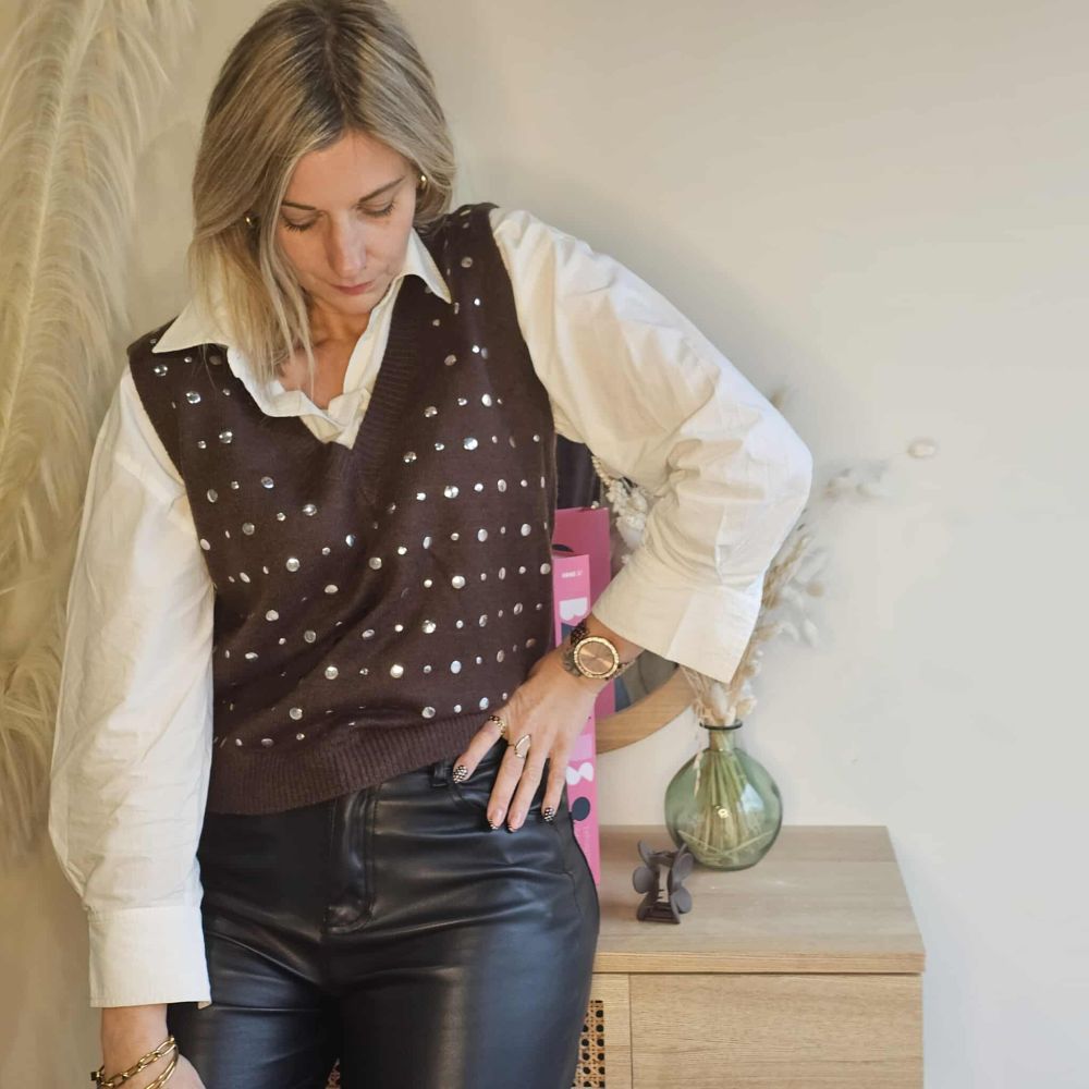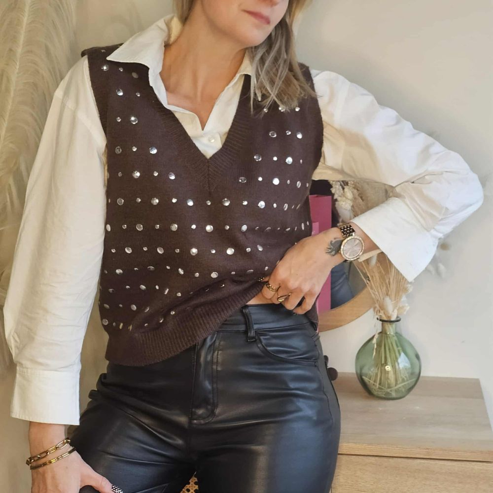 Le pull Pharel chocolat est une pièce élégante et moderne, idéale pour sublimer vos tenues d’automne et d’hiver. Sa maille douce couleur chocolat est rehaussée de jolis clous argentés sur le devant, apportant une touche lumineuse et rock. Son encolure en V flatteuse permet de le porter facilement sur une chemise ou un t-shirt selon le style recherché.