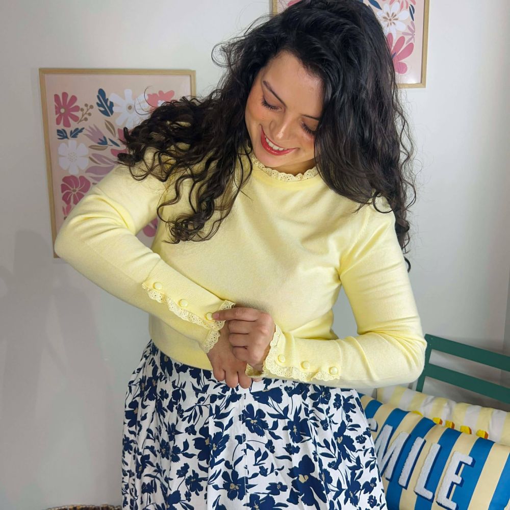 Pull YELLOW – Pull jaune col rond avec dentelle et boutons aux manches