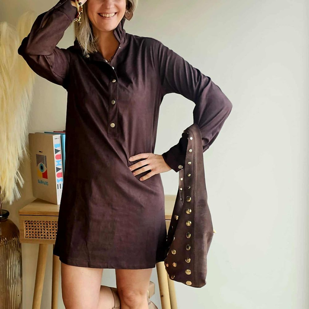 L’atout charme de cette robe ? Son col montant travaillé, qui peut se porter ouvert pour un look décontracté ou fermé pour un style plus chic. Ses boutons nacrés contrastent subtilement avec la teinte chocolat et ajoutent une touche sophistiquée.