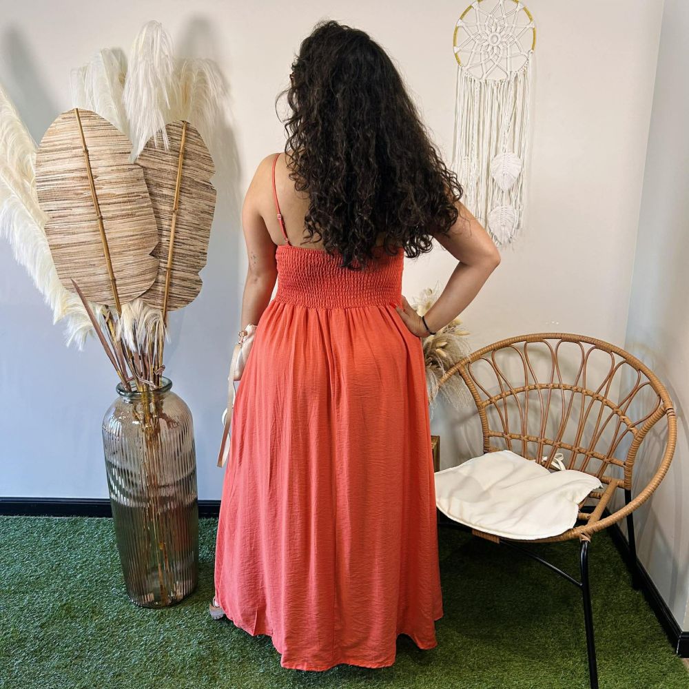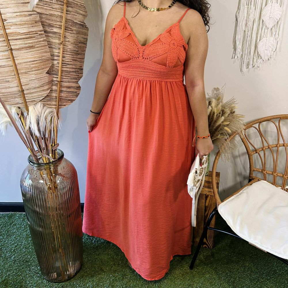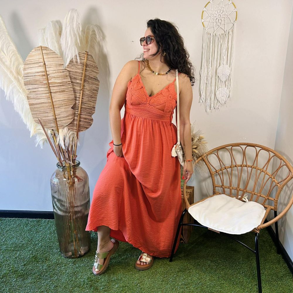 Robe longue terracotta Albane – bohème fluide avec broderies et dos smocké
