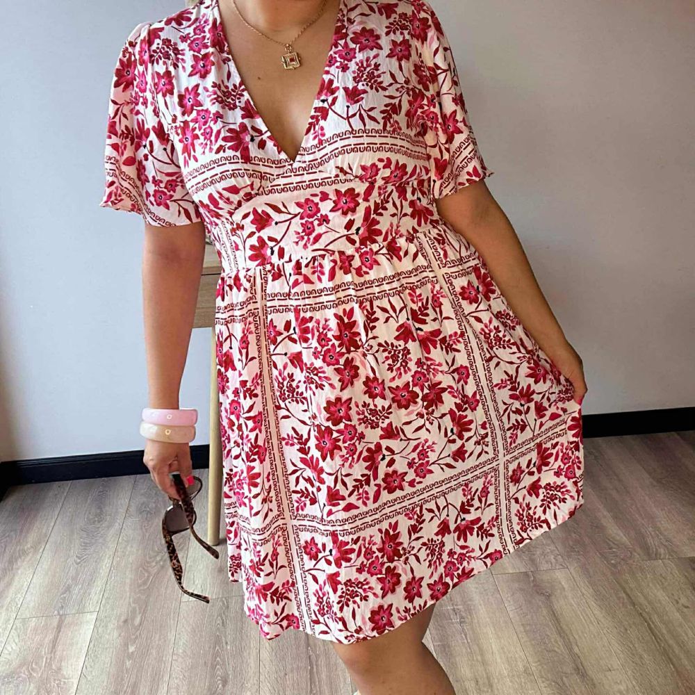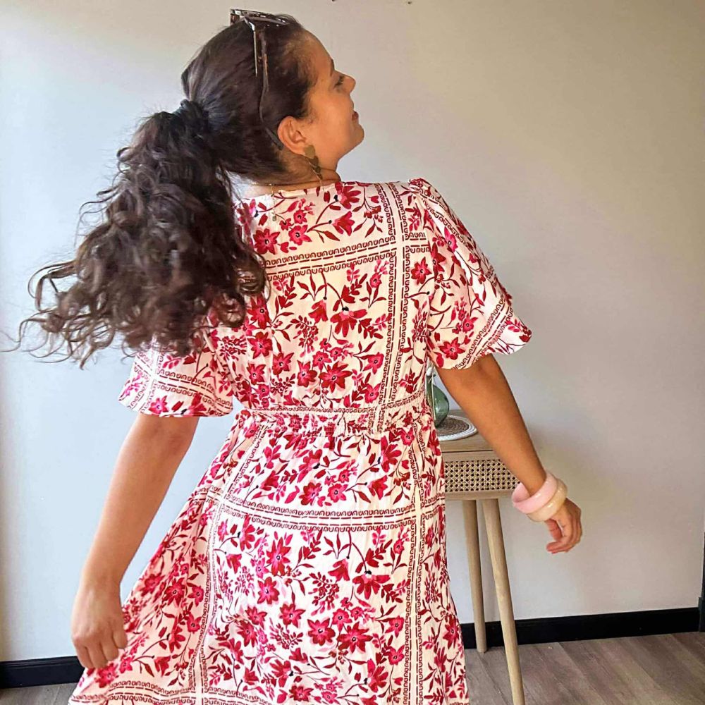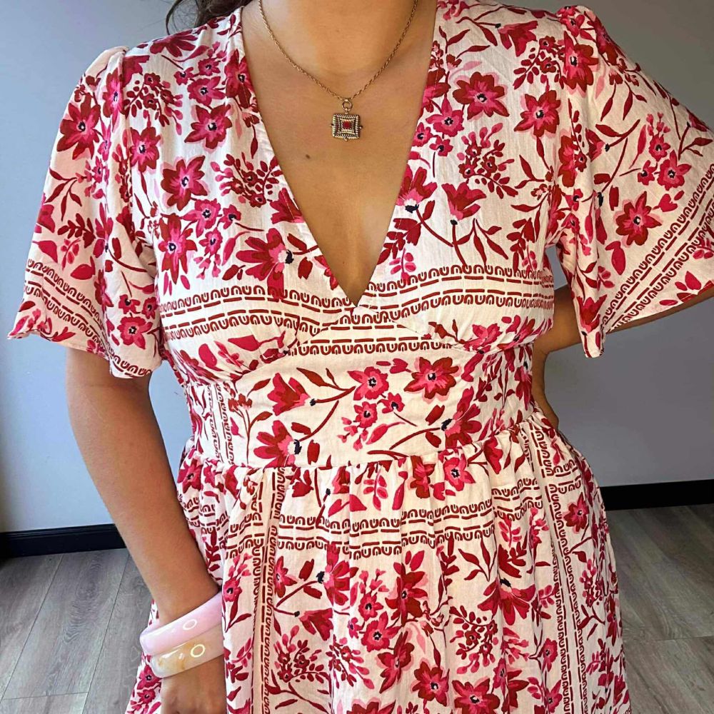 Succombez au charme de notre robe Cassandra, une robe courte à l’allure bohème et romantique, idéale pour les journées ensoleillées ou les escapades estivales. Confectionnée dans une matière légère et fluide, elle arbore un imprimé floral rouge et rose sur fond écru qui évoque la douceur des vacances.