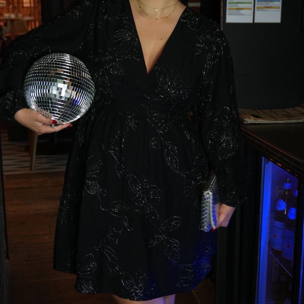 La Robe FLORANE est une pièce élégante et féminine, idéale pour briller tout en douceur. Son tissu noir est rehaussé d’un liséré de paillettes discret, formant de jolis motifs qui apportent de la lumière sans en faire trop.