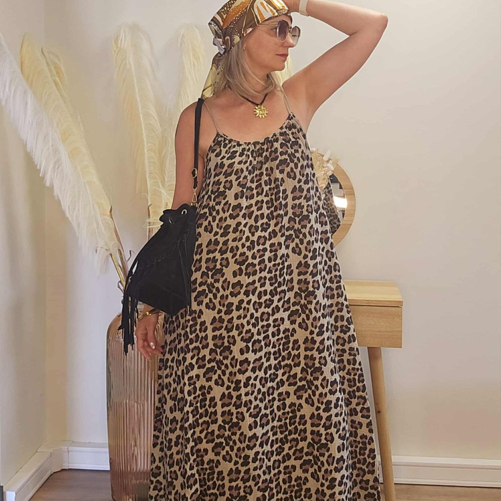 Affirme ton style avec cette robe longue fluide à imprimé léopard, parfaite pour un été audacieux et féminin. Son tissu léger et vaporeux glisse sur la peau, idéal pour les journées ensoleillées ou les soirées d’été.