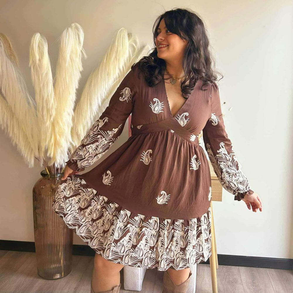 La robe Olympe allie élégance et confort avec sa coupe empire et son col V croisé flatteur. On adore ses broderies écrues esprit cachemire qui contrastent joliment avec le tissu marron. Ses manches longues et sa jupe évasée apportent une touche bohème chic, idéale au quotidien comme pour une occasion spéciale.