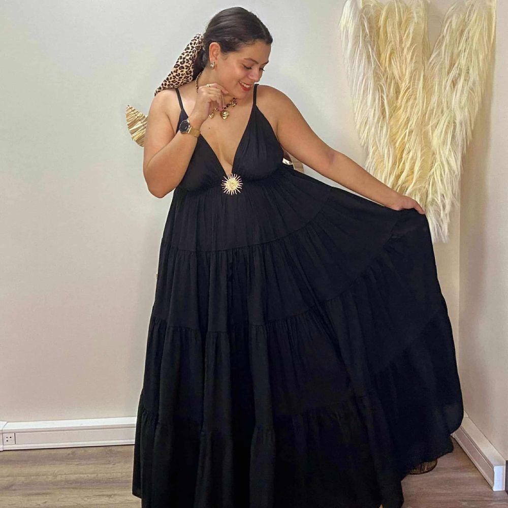 Succombez comme nous au charme de notre robe Sidonie, une pièce noire iconique au charme solaire. Avec son décolleté profond sublimé par un bijou doré en forme de soleil, elle célèbre la féminité sous son plus beau jour. Sa coupe fluide et vaporeuse, structurée par de larges volants, offre un tombé aérien et flatteur pour toutes les silhouettes.