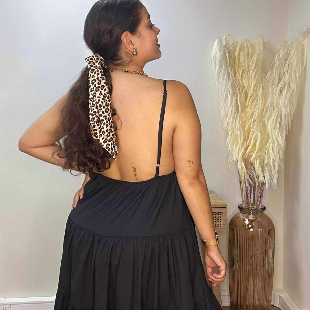 À l’arrière, son dos nu délicat révèle subtilement la peau pour une touche sensuelle, tandis que ses fines bretelles ajustables assurent un maintien optimal. Une robe bohème chic pensée pour illuminer vos journées comme vos soirées d’été, à porter pieds nus sur le sable ou rehaussée d’accessoires dorés pour briller sous les étoiles.
