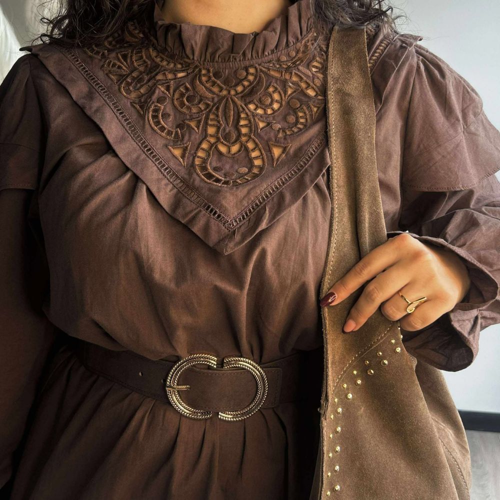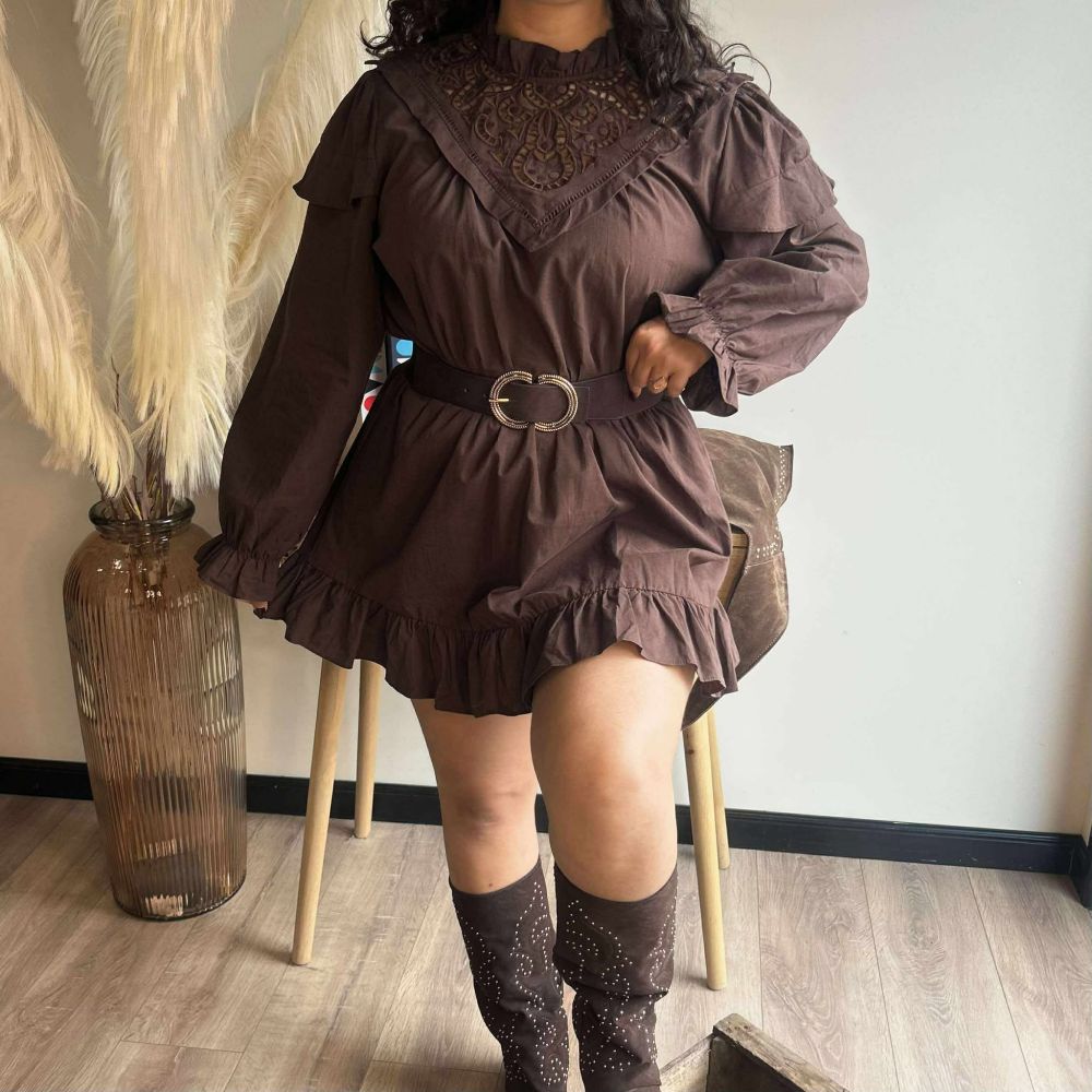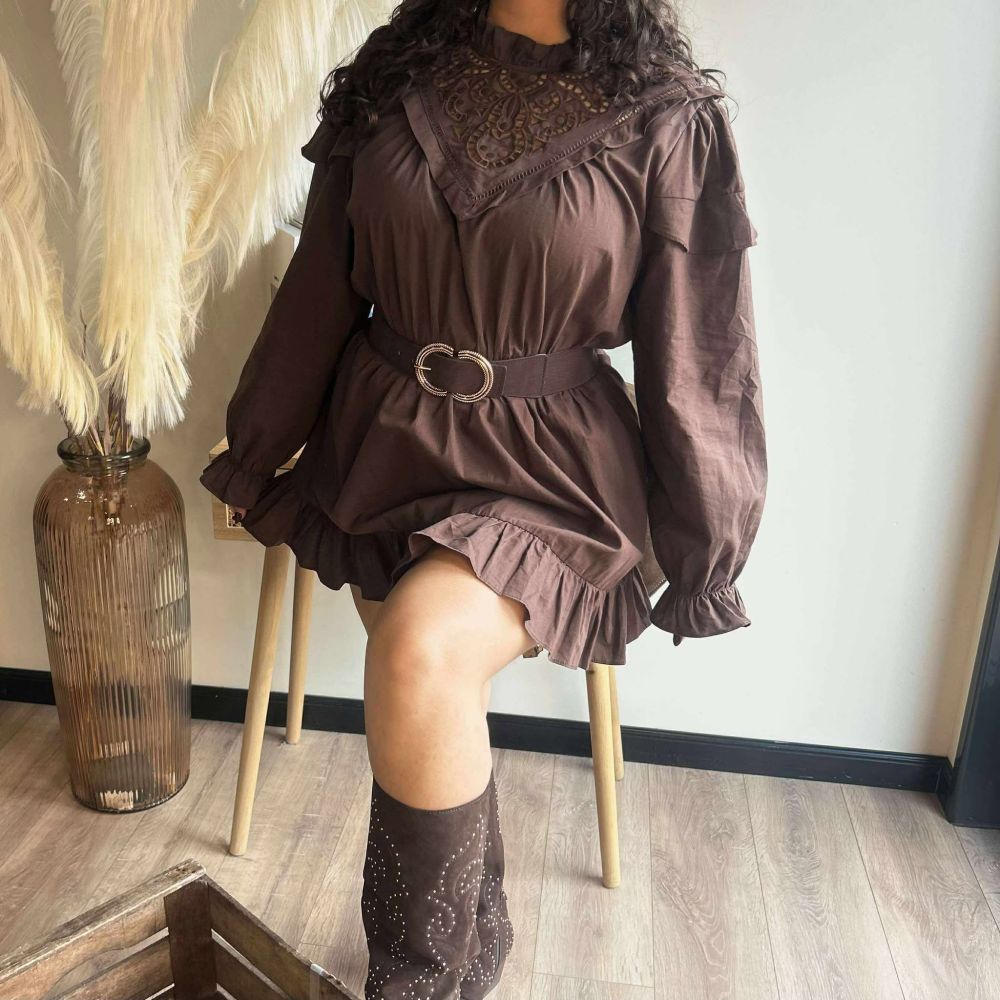 Découvrez la Robe Solène, une pièce irrésistiblement féminine qui allie charme bohème et allure vintage. Confectionnée dans un tissu fluide et léger, cette robe courte couleur chocolat profond sublime toutes les silhouettes grâce à sa coupe légèrement évasée et sa ceinture assortie à boucle dorée.