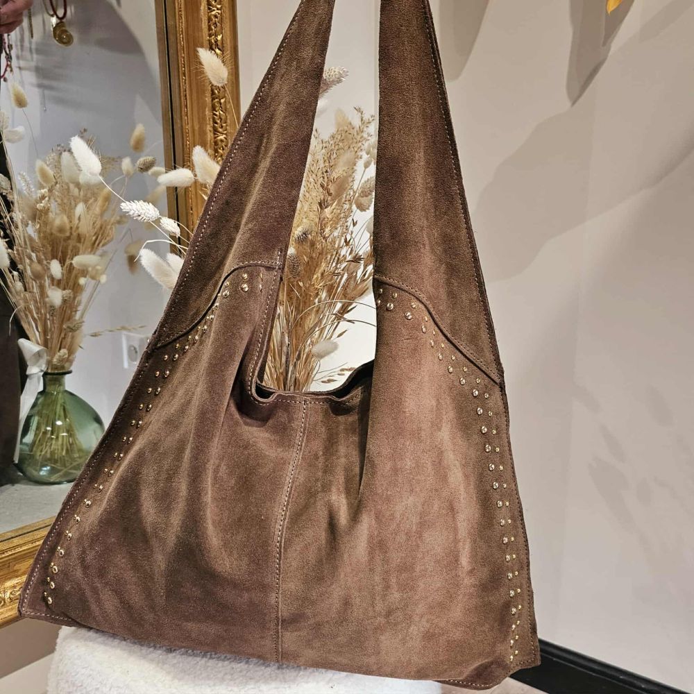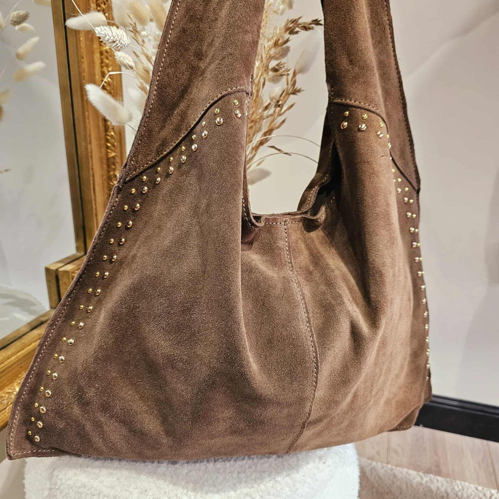 Le sac Suzie est un sac grand format en cuir véritable qui allie élégance et praticité. Sa matière en cuir marron souple et résistant lui confère un style intemporel et une durabilité exceptionnelle. Les petits clous dorés placés de façon discrète sur les côtés ajoutent une touche chic et moderne, sans en faire trop.