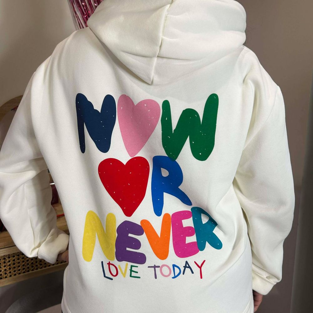 Message “Now or Never Love Today” sur le devant et dans le dos