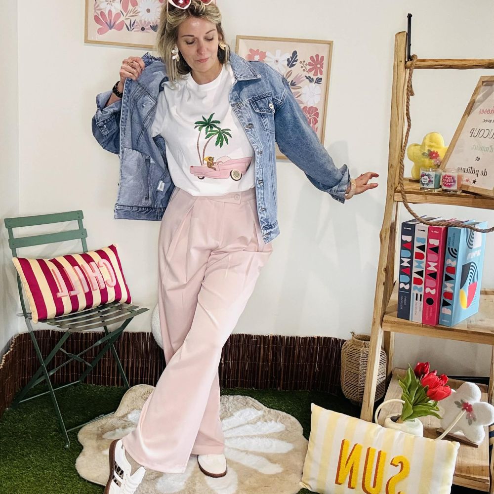Motif : voiture décapotable rose, léopard stylisé et palmiers tropicaux