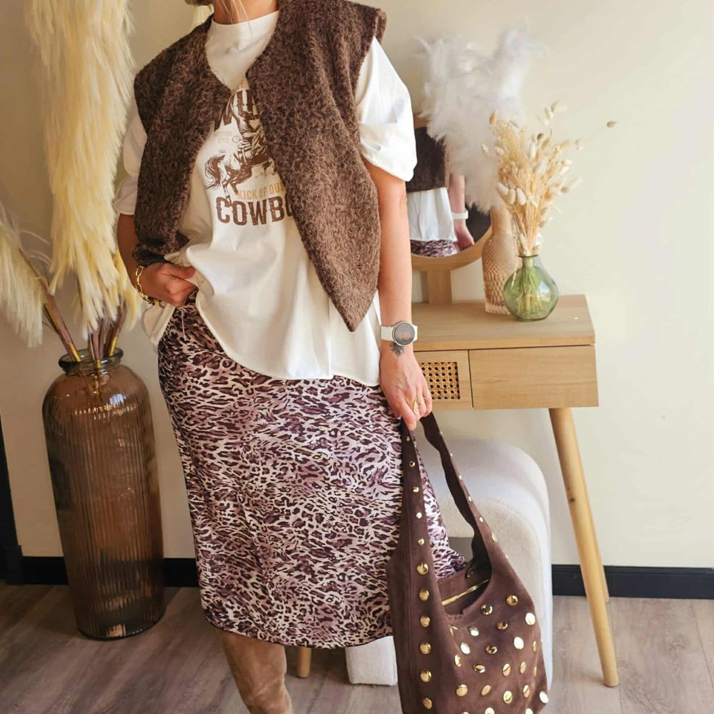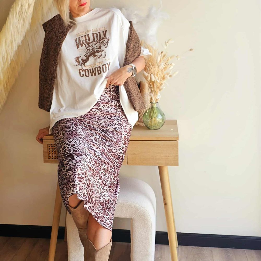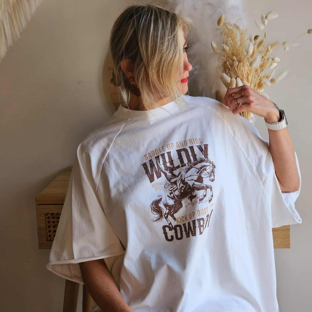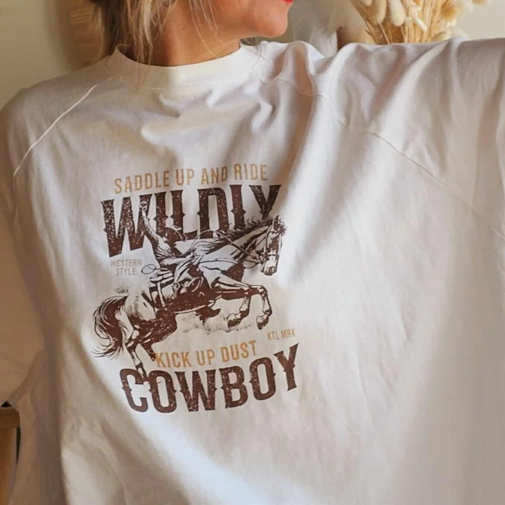 Le tee-shirt Cowboy affiche un style vintage et décontracté grâce à son imprimé western inspiré de l’univers cowboy. Sa coupe très oversize apporte confort et modernité, parfait pour un look tendance et effortless. Confectionné en coton doux, il se porte aussi bien rentré dans un jean que loose sur un short ou une jupe pour un style street et casual.