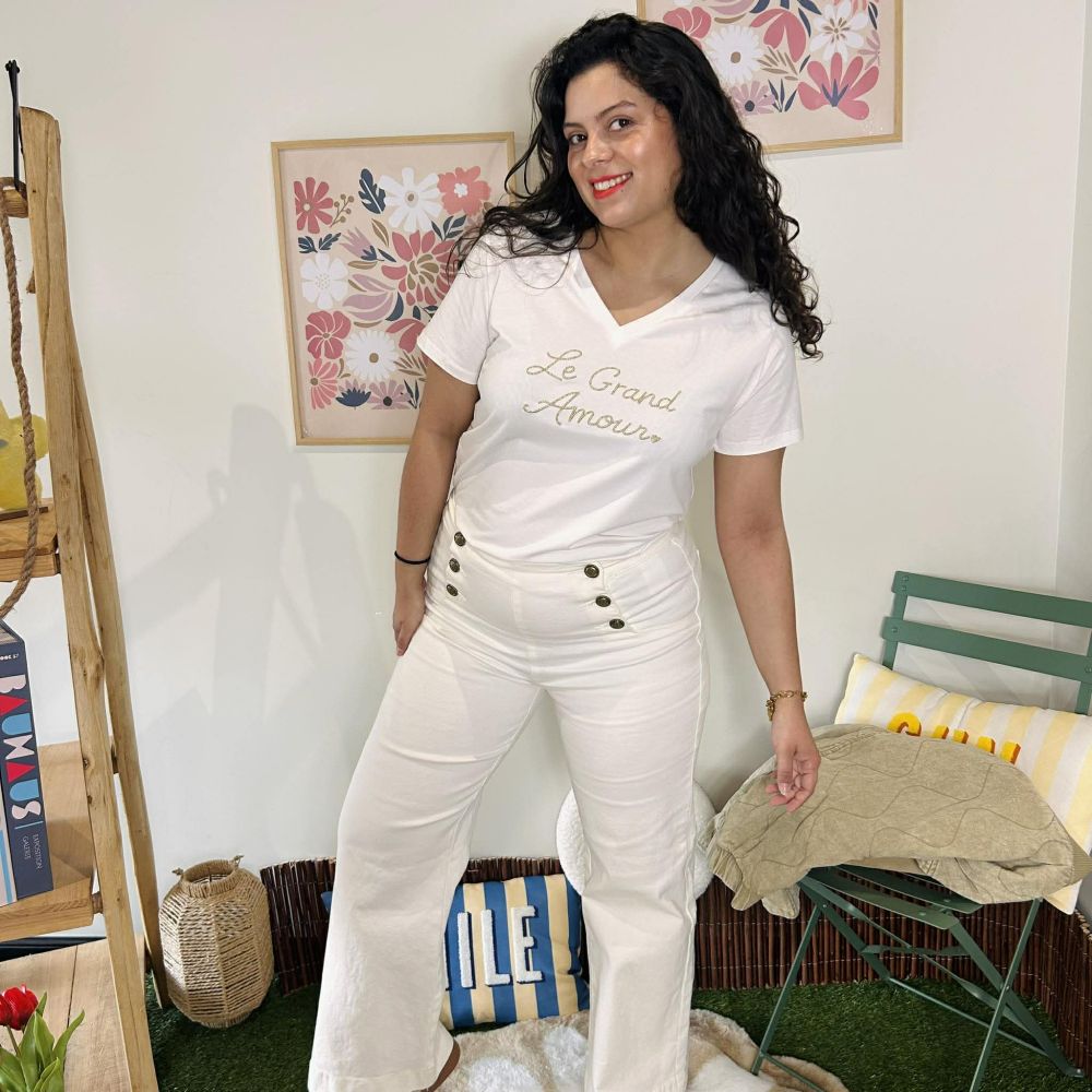 T-shirt Le Grand Amour Blanc – Col V & Écriture Dorée