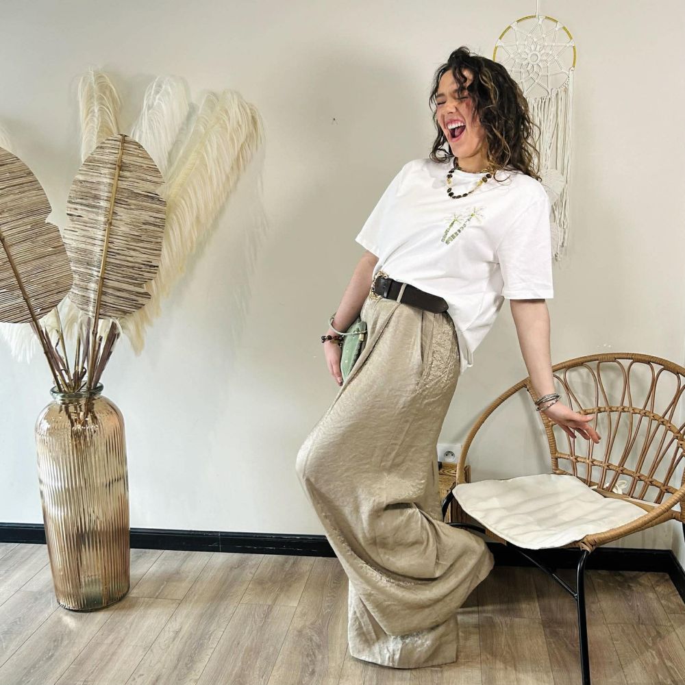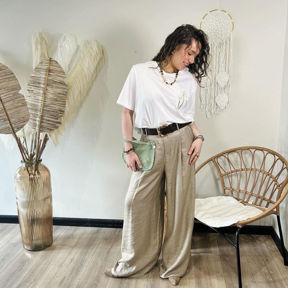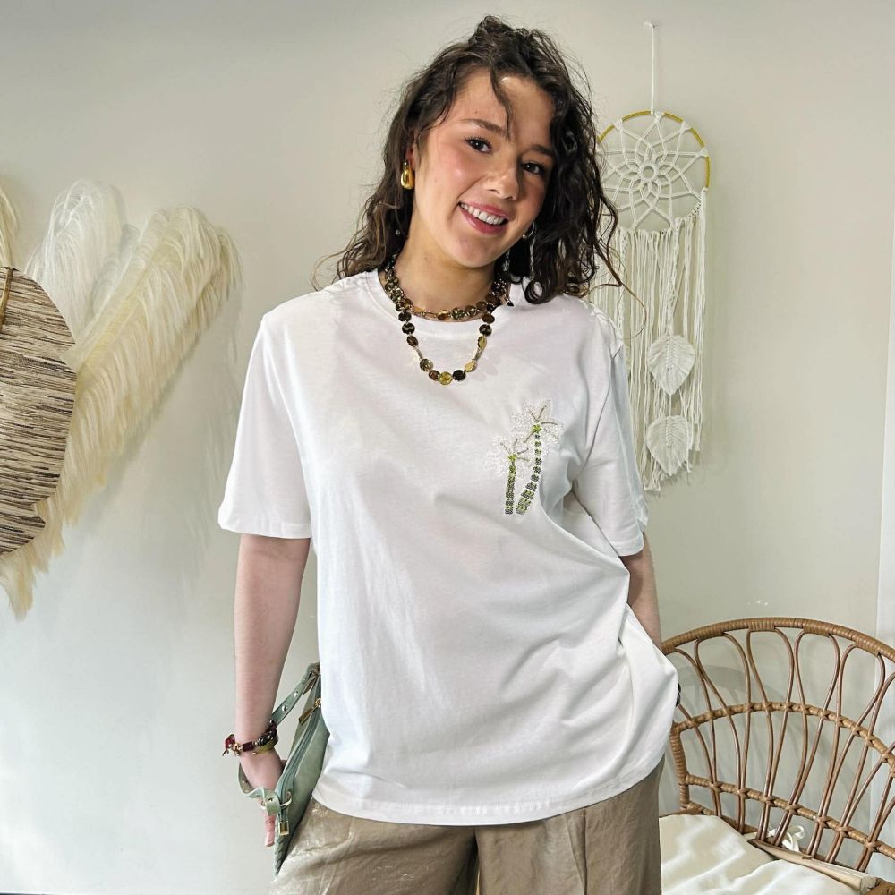 Son détail signature : un palmier délicatement brodé et orné de perles vertes, qui évoque immédiatement une ambiance estivale et bohème. Ce motif raffiné apporte du relief et une touche lumineuse à ce basique revisité !