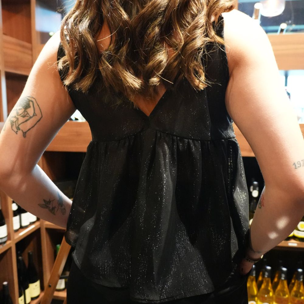 Le Top BRITNEY noir est la pièce scintillante idéale pour briller pendant les fêtes. Sa coupe fluide et légèrement évasée met la silhouette en valeur, tandis que son tissu légèrement transparent apporte une touche glamour raffinée. Le décolleté en V est sublimé par un travail délicat de sequins et perles, offrant un rendu lumineux et festif.