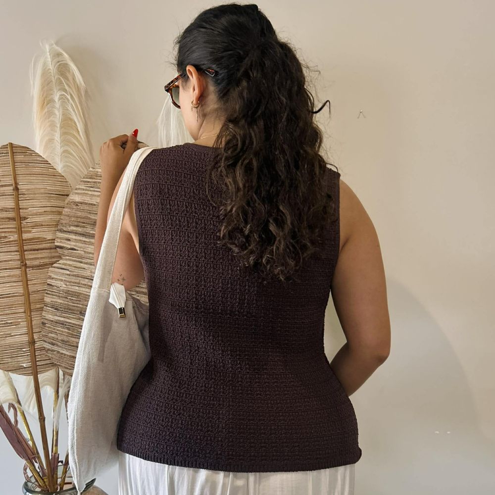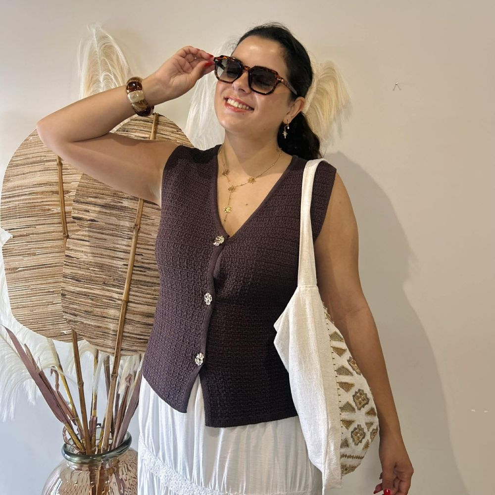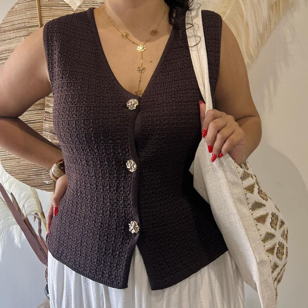 Top crochet marron Claudia – Gilet sans manches col V avec boutons dorés